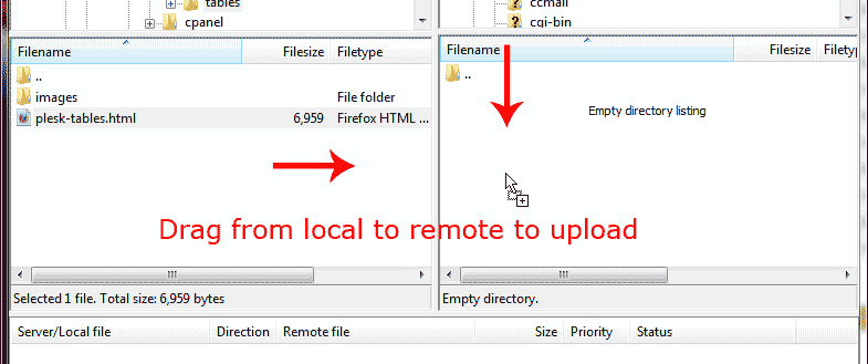To upload files from your local computer to your server, you simply drag the files from your “Filename” Window underneath the “Local Site” Window to the “Filename” Window underneath the “Remote Site” window. See the image below for an exact representation of how to do this.