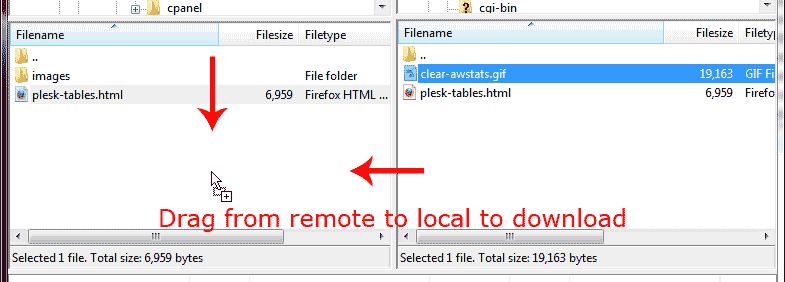 Just like uploading to your server, you can download files to your local computer by dragging files from the “Filename” window underneath the “Remote Site” window to the “Filename” window underneath the “Local Site” Window. The snapshot below shows the details.