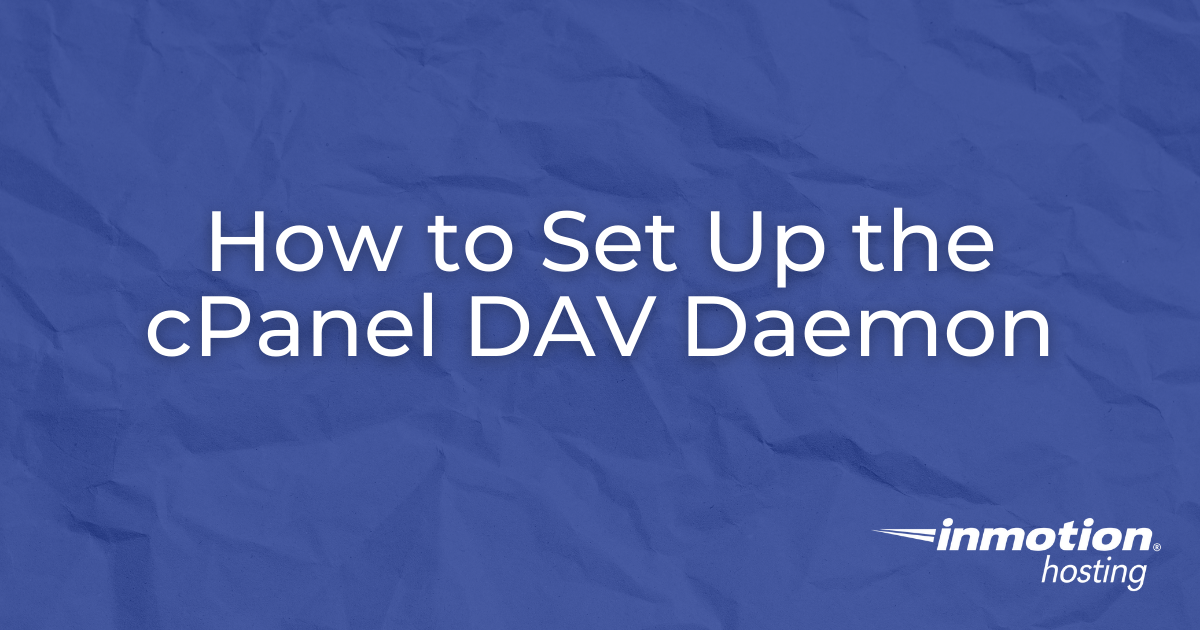 How to Set Up the cPanel DAV Daemon Updated on September 23, 2025 by InMotion Hosting Contributor The cPanel DAV Daemon enables a set of extensions that allow users to manage website data remotely. For example, CalDAV is an extension that allows multiple devices to access and manage calendar data on a remote server simultaneously. With CalDAV, you can create, share, edit, and remove calendar events using your server to host them. The following Read More >