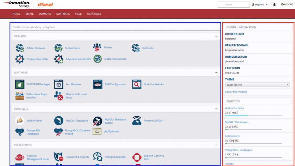 The cPanel Layout Updated on March 11, 2024 by Brad Markle 1 Minutes, 2 Seconds to Read Since you have successfully logged in to cPanel, you will see the cPanel interface. This can be a bit overwhelming if you have never worked with cPanel and this is your first time logging in. We’ll discuss the most important features in cPanel. Here is a screenshot of cPanel with the two main sections outlined in red and blue. The RED section is your website statistics. This shows general information such as your Shared IP address, Disk Space, what server you are on, how many emails accounts you have, how many databases you have ,and much more. This information will change based on any modifications you may make to your account. The BLUE section are the features of cPanel that you have control over. Each section has it’s own header to better organized the options in common groups. The main sections most customers use is Mail, Files, and Databases. Did you know you could brand your cPanel accounts if you are reselling hosting? Learn more about reseller hosting with cPanel. Please check the next article on Using the cPanel Video Tutorials. If you missed our previous article, please see the How to log into cPanel tutorial. For more information on this course please visit Getting Started in cPanel. Share this Article Related Articles How to Configure cPanel in WHM Resetting the cPanel Password in WHM How to Import Email Accounts and Forwarders into cPanel How to Install WHMCS With Softaculous What is your default PHP.ini file? How to Create / Delete an FTP Account in cPanel How to Park a Domain in cPanel How to Permanently Delete Trash in File Manager The Complete Guide to cPanel Backups How to Delete a cPanel in WHM