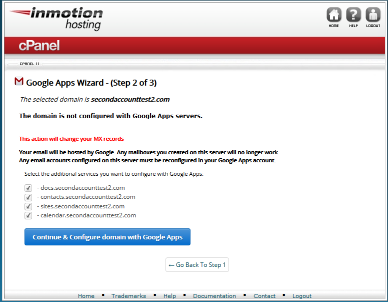 Setting up Google Workspace MX Records in cPanel Updated on January 4, 2024 by Scott Mitchell 1 Minutes, 46 Seconds to Read One of our newest features for our Shared Hosting accounts allows you to connect your site to Google Workspace with a one-click wizard. Many customers use Google Apps for their business and would like to have that set up for their site. While simple, it can be tedious. We understand that, so we added the Google MX Wizard to our cPanel so you can do it all in under a minute or two. Note that you must have a Google Workspace account in order to set your domain up with the Google Apps tool. If you don’t see the Google MX Wizard option in your cPanel, you will need to contact our live technical support team. This option may not be immediately available on VPS or Dedicated server accounts. If you have a VPS or Dedicated server you can make the MX modifications to your accounts via the WHM. What is Google MX Wizard? According to Google: “Google MX Wizard is a suite of Google applications that brings together essential services to help your business. This is a hosted service that lets businesses, schools, and institutions use a variety of Google products — including Email, Google Docs, Google Calendar, and Google Talk — on a unique domain (e.g., www.yourcompany.com).“ How to set up Google MX Wizard within the cPanel Log into your cPanel dashboard. Using the cPanel interface, locate the Email category and click on the Google MX Wizard You are taken to the first step in the Wizard. Select the domain name you want to connect to your Google Apps account from the dropdown list. On the second step, select any of the optional features you want to set up for your domain if any. Once you have finished, click on the Continue and Configure domain with the Google Apps button. A quick confirmation screen pops up. Click on the OK button in order to continue the setup. This screen displays the changes that the wizard makes as it goes along. Once it finishes, your Google Apps configuration will be complete. Share this Article Related Articles How to Configure cPanel in WHM Resetting the cPanel Password in WHM How to Import Email Accounts and Forwarders into cPanel How to Install WHMCS With Softaculous What is your default PHP.ini file? How to Create / Delete an FTP Account in cPanel How to Park a Domain in cPanel How to Permanently Delete Trash in File Manager The Complete Guide to cPanel Backups How to Delete a cPanel in WHM