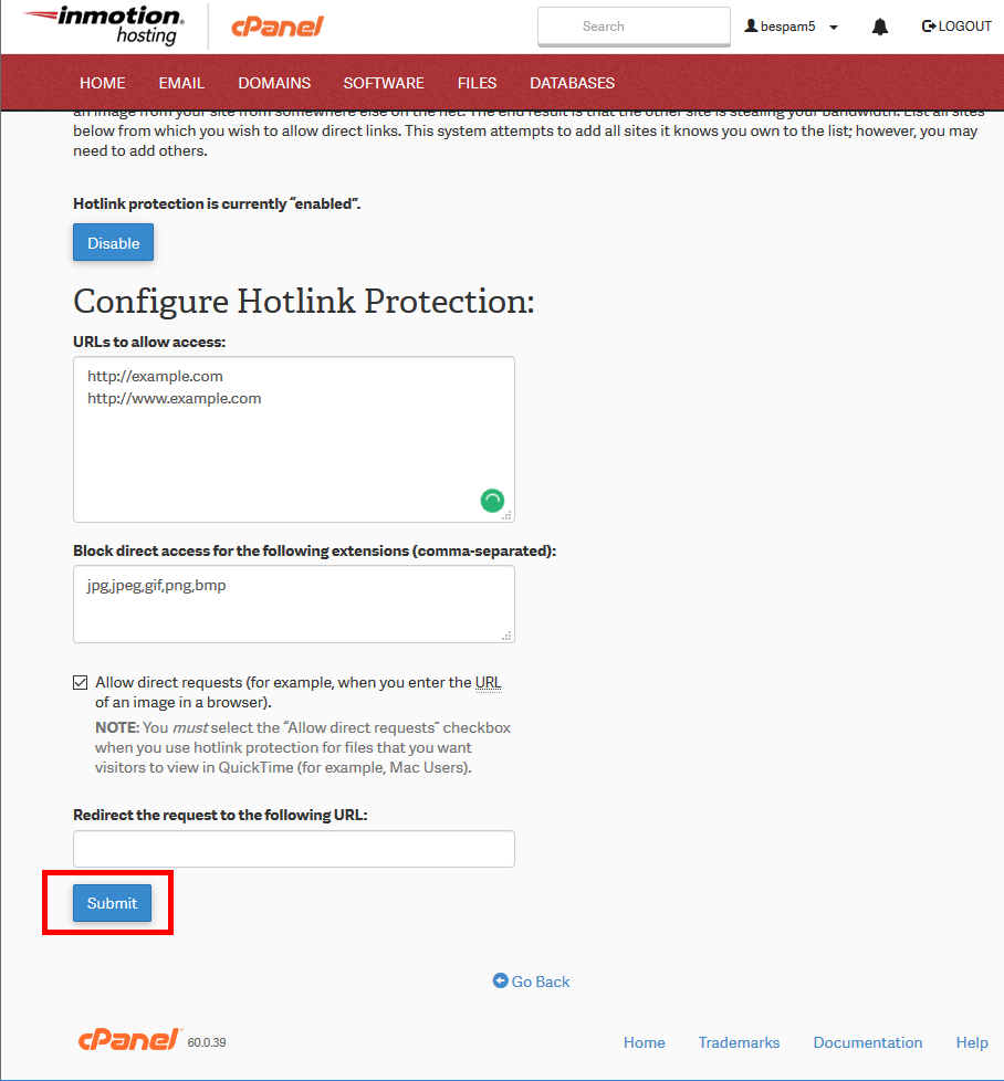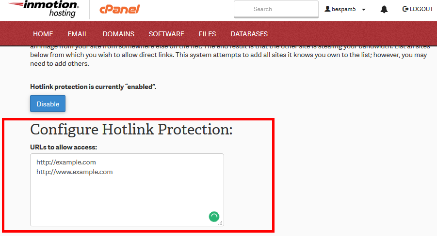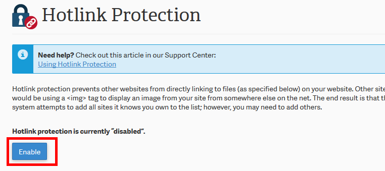 I keep clicking the enable Hotlink Protection Button and then I get a green message saying it was enabled but when I go back to the Hotlink Protection page it says that Hotlink Protection is disabled. I’ve refreshed my page several times and it still shows the same way. Is this a glitch on the cpanel?