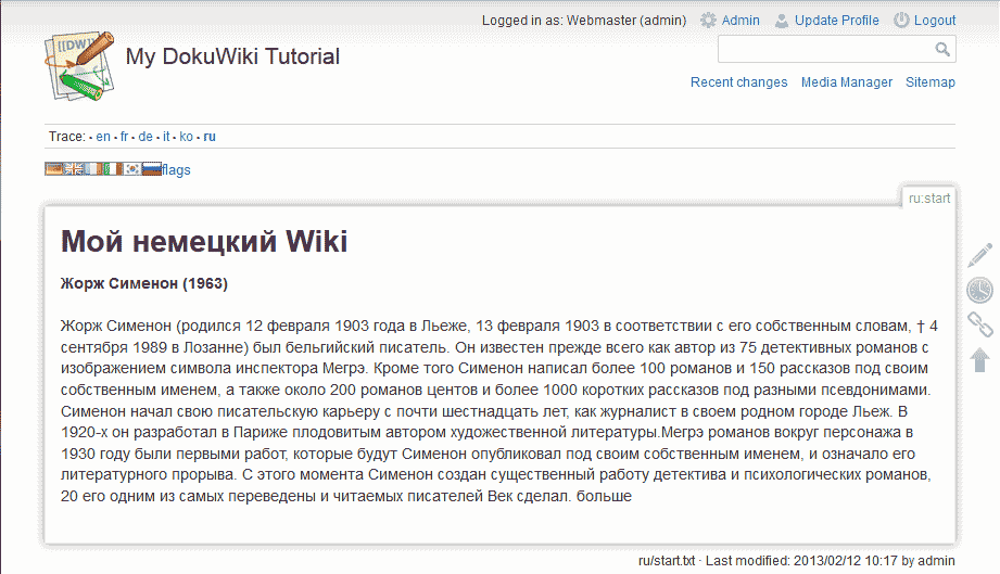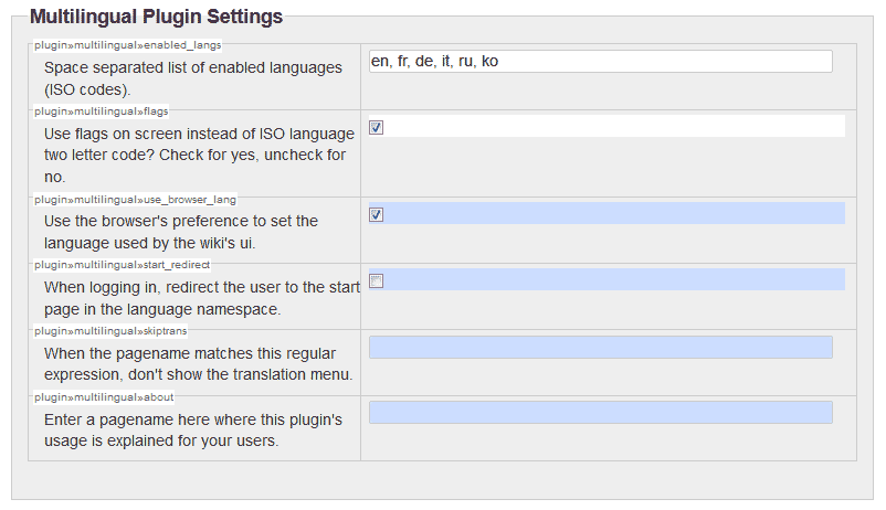 Configuring the Multilingual Plugin in DokuWiki Updated on August 16, 2021 by InMotion Hosting Contributor 2 Minutes, 36 Seconds to Read Once you have the Multilingual plugin installed, you will need to configure and set up your pages in different languages. The Multilingual plugin creates a namespace for each language. Each language can be represented by a text link or by a flag that represents the language. See the image below for what the flags look like. The flags will only display if the language is supported on DokuWiki. Unfortunately, we do not have a list of supported languages for DokuWiki. The image to the right shows what the basic page in English looks like. The following steps will explain how to set up your DokuWiki for more than one language. Important! The multilingual plugin does not translate your site into multiple languages. Each Language has a namespace created and links to each language page. Configuring the Multilingual plugin Log into DokuWiki. Click the Admin link at the top right and go to Configuration Manager. Find the “Multilingual Plugin Settings“. The available settings are as follows. Multilingual Plugin Settings Space separated list of enabled languages (ISO codes). This allows the different language links to show on the page. The format is like follows: en, fr, de, it, ru, ko Use flags on screen instead of ISO language two letter code? Check for yes, uncheck for no. This will show the language country flag in the links. Use the browser’s preference to set the language used by the wiki’s ui. This will detect the language of the browser and set the language to the browser language. When logging in, redirect the user to the start page in the language namespace. This will allow the specific language page to load when logging in. When the pagename matches this regular expression, don’t show the translation menu. This allows a regular expression to be used to remove the language links from the page. Enter a pagename here where this plugin’s usage is explained for your users. Allows a page to be created that explains how the Multilingual plugin works. Click the “Use flags on screen instead . . .” check box to enable the language country flag in the menu. Save the changes. Now the flags will show on your menu. Flags that are dim are pages that have no content. Flags that are fully visible are pages with content. See image to the right. When the Multilingual plugin is first set up, all the flags will be dim. This is because the language plugin only creates a namespace. The content has to be inserted into the page. Click one of the Language flags. Create the page for the language for the flag you clicked. You can insert the same homepage text for each. You can use a translator like Google translate to create the initial page. The images to the right is what the page will look like in Russian and Korean. Create the home pages for all the languages so that there is a page available for those who speak the particular language. Important! Each page will need to be created individually The Multilingual Plugin only creates namespaces and does not translate your existing language into other languages. Share this Article Related Articles Installing DokuWiki with Softaculous Installing DokuWiki Manually How to log into DokuWiki How to manage users in DokuWiki How to create pages in DokuWiki Changing the DokuWiki template How to change the DokuWiki logo DokuWiki Basic Settings: Site title, Site URL, and License Removing the DokuWiki footer buttons and text How to use the menu plugin in DokuWiki