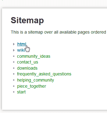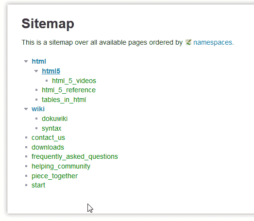How to create namespaces in DokuWiki Updated on August 16, 2021 by InMotion Hosting Contributor 3 Minutes, 30 Seconds to Read What is a Namespace? A Namespace is a folder location where your page resides, much like how you can organize files on your computer using folders and subfolders, wiki pages are organized into Namespaces. For information on creating pages, please click here. Namespaces are crucial for organizing your pages within your wiki. In other words, DokuWiki can store pages in sub locations or folders to organize your pages into sub categories. This is seen in the sitemap of the site (Image is below to the right). For example, if you want to separate the pages to topics, you can place the pages under those Namespace names like the following. Root (This is the root folder where all pages go) HTML (Namespace is HTML) HTML Basics (Subpage in HTML Namespace) HTML 5 (Subpage in HTML Namespace) HTML Reference (Subpage in HTML Namespace) wiki (Default Namespace name) dokuwiki (Subpage in wiki Namespace) syntax (Subpage in wiki Namespace) Page in root (This page reside in the Root Namespace) Another page in root (This page reside in the Root Namespace) start (This page reside in the Root Namespace) You can see the Namespace and page structure where Namespaces are blue and pages are green. The root directory name is not listed in the website sitemap itself. Click the Sitemap link at the top right of the page to see the sitemap similar to the image to the right. The Sitemap shows the Namespaces and their pages within them. The image to the right shows a basic DokuWiki sitemap with the name spaces in blue and the pages in green. Namespaces can also be seen when creating links in the DokuWiki editor. The Link wizard will show like the snapshot to the right. The Namespaces show as gold folder icons and the pages as blue note paper icons. For information on the Link wizard, see the article Inserting internal links in DokuWiki. How to create a Namespace in DokuWiki The next 2 sections will explain how to create Namespaces. Namespaces can be placed in the root directory or within other namespaces (like folders and subfolders on a computer). The following sections will explain these in detail. Creating a Namespace in the Root directory Log into DokuWiki. Type the Namespace first and then the page name separating them with a : in the search box. The text you enter in the search should look like the following. nameofspace:Your new page name Note!!: Supplement nameofspace: with your new Namespace name. Namespaces have the : after them to designate it as a Namespace. Type the name of the page you are creating after the : of the Namespace name. (In this case we entered “html:html 5 reference“.) Namespaces need to have a page created with it. You can’t just create a namespace. It should look like the snapshot to the right. Click the search magnifying glass icon. You will get a page not found. Click the pencil on the right that says “Create this page”. Insert text and save the changes. Click the Sitemap link at the top right. The new Namespace name (In this case “html“) will show in the menu like the image to the right with the page in it. Create a Namespace within another Namespace Log into DokuWiki. Type in the search box the first Namespace name and then the second subNamespace separating them with a : colon. The page name goes after the :. It should look like the following text. nameofspace:subNamespace:Your new page name Note!!: Supplement nameofspace: and subNamespace: and the Your new page name with your names. (Namespaces have the : after them to designate it as a Namespace.) In this case we entered “html:html5:html 5 Videos“. It should look like the image to the right. Click the search magnifying glass icon. Click the pencil to the right that says “Create this page” to create the page. Add content and Save the page. Click the sitemap link at the top right. You will see the Namespace (In this case “html:html5“) within another Namespace as a subsection like the right snapshot. Now that you created Namespaces, you may want to rename or delete a Namespace. The next article will explain how to delete and rename Namespaces. Share this Article Related Articles Installing DokuWiki with Softaculous Installing DokuWiki Manually How to log into DokuWiki How to manage users in DokuWiki How to create pages in DokuWiki How to change the DokuWiki logo Changing the DokuWiki template DokuWiki Basic Settings: Site title, Site URL, and License Removing the DokuWiki footer buttons and text How to use the menu plugin in DokuWiki