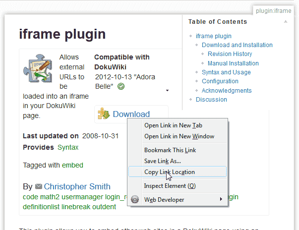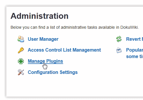 Installing plugins in DokuWiki Updated on August 16, 2021 by InMotion Hosting Contributor 1 Minutes, 22 Seconds to Read When working with DokuWiki there arises many instances where you will need to install a plugin. Plugins give functionality to your site that the default installation does not have available. DokuWiki has an relatively easy way to install plugins through the administrators dashboard. Below are the steps to install a plugin in DokuWiki. Steps to install a plugin in DokuWiki Log into DokuWiki. Click Admin at the top right of your DokuWiki. Select the Manage Plugins in the list of Administration tasks. You will see the plugin management section. You will need to place the URL for the plugin in the “Download and install a new plugin” URL box. Go to the plugin site and get the URL for the plugin. An Example of a plugin URL looks like the following: https://www.dokuwiki.org/lib/exe/fetch.php?hash=c65896&media=http%3A%2F%2Fdokuwiki.jalakai.co.uk%2Fplugin-iframe.zip https://www.dokuwiki.org/lib/exe/fetch.php?hash=0a7954&media=http%3A%2F%2Fdokuwiki.jalakai.co.uk%2Fplugin-iframe.tar.gz Paste the URL for the plugin in the “Download and install a new plugin” URL box. Click Download. If the URL is correct you will get a “Plugin package . . . successfully installed” confirmation. A URL that does not access the plugin for download, you will get an “Unable to download the plugin file” error in red.. Important! If the plugin fails to download, check the URL you received from the plugin developers site. You may need to get a different URL for the plugin. When you visit your plugin Manager, you will see the plugin show up in the “Installed Plugins” list. Share this Article Related Articles Installing DokuWiki with Softaculous Installing DokuWiki Manually How to log into DokuWiki How to manage users in DokuWiki How to create pages in DokuWiki How to change the DokuWiki logo Changing the DokuWiki template DokuWiki Basic Settings: Site title, Site URL, and License Removing the DokuWiki footer buttons and text How to use the menu plugin in DokuWiki
