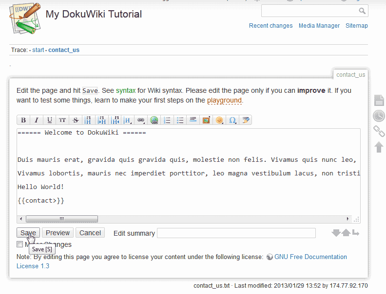 Installing the Modern Contact plugin in DokuWiki Updated on August 16, 2021 by InMotion Hosting Contributor 3 Minutes, 51 Seconds to Read Installing a Contact form on your DokuWiki site can be somewhat complex. DokuWiki does not have any contact form capability built into their software. In order for you to get a contact form on your DokuWiki site, you will need to use a plugin. This tutorial will explain how to use the Modern Contact plugin for DokuWiki. Steps to use the Modern Contact plugin Download and Install the plugin In order to create a contact form in your wiki you will need to use the Modern Contact plugin. The following explains where to download and how to install the plugin. Visit the following url where the plugin can be downloaded from. https://www.dokuwiki.org/plugin:contactmodern Click the Download link. Get the URL for the plugin. You can right click the download link and copy the Link Location or get the link from the browser address bar. The link for the plugin should look like the following. https://github.com/downloads/marvinrabe/dokuwiki-contact/moderncontact_2012-06-06.zip Log into DokuWiki. Click the Admin link at the top right side. Select the “Manage Plugins” link. Paste the URL you obtained from the plugin download site in the “Download and install a new plugin” box. Click Download. You should see a green confirmation saying, “Plugin package (2 plugin(s ): __MACOSX,moderncontact) successfully installed“. Now the plugin will show in the “Installed plugins” list. Add Modern Contact plugin code Once you have the Modern Contact plugin installed, you can add the code to your wiki page that is designed to store your Contact form. The following are example codes you can use in your wiki Contact page. {{contact>}} {{contact>subj=Contact the Developer}}} {{contact>to=Admin|subj=Contact the Developer}} The table below has a brief description of the attributes available for the contact form code. Attribute Description subj This will allow the subject to be specified in the form removing the subject input from the contact form. to The username can be specified here for having a specific user receive the email from the form. captcha This can be set to True or False. True will display the reCAPTCHA and false will hide it. Below are the steps to add the code to your wiki page. Find the page you want to add the contact form to and edit it. To have the basic form display, add the following code to your page. {{contact>}} Save the changes. Before the contact form will display on your page, you will need to fix the code in the plugin. The following will explain how to fix the plugin code. Fixing the Modern Contact plugin code To fix the code, we will need to “find and replace” a specific code in one of the files of the plugin. This is because the plugin developers have not created a fix for a bug in the plugin. Important! When using find and replace, its important to make sure you typed the words correctly and that you have a backup of the plugin. Find and replace cannot be undone so be careful. Below are the steps to take for finding and replacing the code to make the Modern Contact form to work. Login into your cPanel. Go to the File Manager. Select your DokuWiki installation directory and click go. Navigate to the following file location. lib/plugins/moderncontact/syntax.php Open the file in the code editor. Press Ctrl + F on your keyboard to open the find and replace box. Find and replace the following code: contactmodern Replace it with the following: moderncontact Open the file in the code editor. Save the changes. Configure the Modern Contact plugin Settings In order for the Contact form to work completely, you will need to configure the plugin. You can get a “reCAPTCHA” key from Google to have the “reCAPTCHA” work on your form. The below steps will explain how to configure the Modern Contact plugin. For more information on the Google “reCAPTCHA” private and public keys, please see our article on How to get the public and private keys for Google reCAPTCHA. Log into DokuWiki. Click the Admin link at the top right. Select the Configuration Manager. Scroll to the bottom where it has the Moderncontact Plugin Settings. Here is where you configure the plugin. You can change the default email address for the contact form and enable the captcha here. This is where you will use your Google “reCAPTCHA” public and private keys. Save the changes. Now when you visit the page where you placed the contact form code, you will see the basic contact form show. Share this Article Related Articles Installing DokuWiki with Softaculous Installing DokuWiki Manually How to log into DokuWiki How to manage users in DokuWiki How to create pages in DokuWiki How to change the DokuWiki logo Changing the DokuWiki template DokuWiki Basic Settings: Site title, Site URL, and License Removing the DokuWiki footer buttons and text How to use the menu plugin in DokuWiki