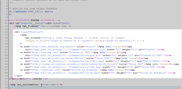 Removing the DokuWiki footer buttons and text Updated on August 16, 2021 by InMotion Hosting Contributor 1 Minutes, 59 Seconds to Read DokuWiki by default will have buttons and the License text at the bottom of each page. In Most cases, the buttons are not desired on the site. You also, may not want the license text there as well, depending on the type of wiki you are building. This article will explain how to remove the button links and the license text from the footer of the DokuWiki theme. Removing the buttons from the footer The DokuWiki footer buttons cannot be removed through the DokuWiki administrator section. The following section will give a step by step instruction for removing these buttons from the footer of the DokuWiki theme code. Login into your cPanel Go to the File Manager. Select your DokuWiki installation location and click Go. Navigate to the following file. public_html/your-dokuwiki/lib/tpl/dokuwiki/tpl_footer.php Open the tpl_footer.php in the file manager code editor. Find the code shown in the snapshot to the right. To keep from breaking the theme accidentally and to retain the original code without deleting it, we will use HTML comments to comment out the button code. HTML comments look like the following. <!-- Code to comment goes here --> Place the beginning comment before the following: <!-- <div class="buttons"> And right after the next div code. </div> --> After saving the file, your wiki should look like the snapshot to the right. Now the Buttons will not show on the footer anymore. Removing the License text from the footer The footer shows License text by default. See image to the right. This text can be completely removed from the site. The following steps will explain how to remove the license text. Login into your cPanel Go to the File Manager. Select your DokuWiki installation location and click Go. Open the tpl_footer.php in the code editor found at the following file location. public_html/your-dokuwiki/lib/tpl/dokuwiki/tpl_footer.php This is the same process as commenting the button code, except in this case we are commenting the following code. <?php tpl_license(''); // license text ?> Commenting should look like the following. <!-- <?php tpl_license(''); // license text ?> --> Save the file and your DokuWiki should look like the snapshot to the right with the License text missing. Share this Article Related Articles Installing DokuWiki with Softaculous Installing DokuWiki Manually How to log into DokuWiki How to manage users in DokuWiki How to create pages in DokuWiki How to change the DokuWiki logo Changing the DokuWiki template DokuWiki Basic Settings: Site title, Site URL, and License Removing the DokuWiki footer buttons and text How to use the menu plugin in DokuWiki