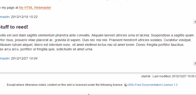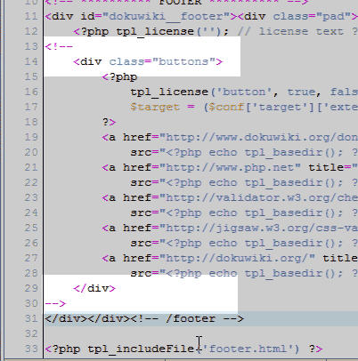 Removing the DokuWiki footer buttons and text Updated on August 16, 2021 by InMotion Hosting Contributor 1 Minutes, 59 Seconds to Read DokuWiki by default will have buttons and the License text at the bottom of each page. In Most cases, the buttons are not desired on the site. You also, may not want the license text there as well, depending on the type of wiki you are building. This article will explain how to remove the button links and the license text from the footer of the DokuWiki theme. Removing the buttons from the footer The DokuWiki footer buttons cannot be removed through the DokuWiki administrator section. The following section will give a step by step instruction for removing these buttons from the footer of the DokuWiki theme code. Login into your cPanel Go to the File Manager. Select your DokuWiki installation location and click Go. Navigate to the following file. public_html/your-dokuwiki/lib/tpl/dokuwiki/tpl_footer.php Open the tpl_footer.php in the file manager code editor. Find the code shown in the snapshot to the right. To keep from breaking the theme accidentally and to retain the original code without deleting it, we will use HTML comments to comment out the button code. HTML comments look like the following. <!-- Code to comment goes here --> Place the beginning comment before the following: <!-- <div class="buttons"> And right after the next div code. </div> --> After saving the file, your wiki should look like the snapshot to the right. Now the Buttons will not show on the footer anymore. Removing the License text from the footer The footer shows License text by default. See image to the right. This text can be completely removed from the site. The following steps will explain how to remove the license text. Login into your cPanel Go to the File Manager. Select your DokuWiki installation location and click Go. Open the tpl_footer.php in the code editor found at the following file location. public_html/your-dokuwiki/lib/tpl/dokuwiki/tpl_footer.php This is the same process as commenting the button code, except in this case we are commenting the following code. <?php tpl_license(''); // license text ?> Commenting should look like the following. <!-- <?php tpl_license(''); // license text ?> --> Save the file and your DokuWiki should look like the snapshot to the right with the License text missing. Share this Article Related Articles Installing DokuWiki with Softaculous Installing DokuWiki Manually How to log into DokuWiki How to manage users in DokuWiki How to create pages in DokuWiki Changing the DokuWiki template How to change the DokuWiki logo DokuWiki Basic Settings: Site title, Site URL, and License Removing the DokuWiki footer buttons and text How to use the menu plugin in DokuWiki