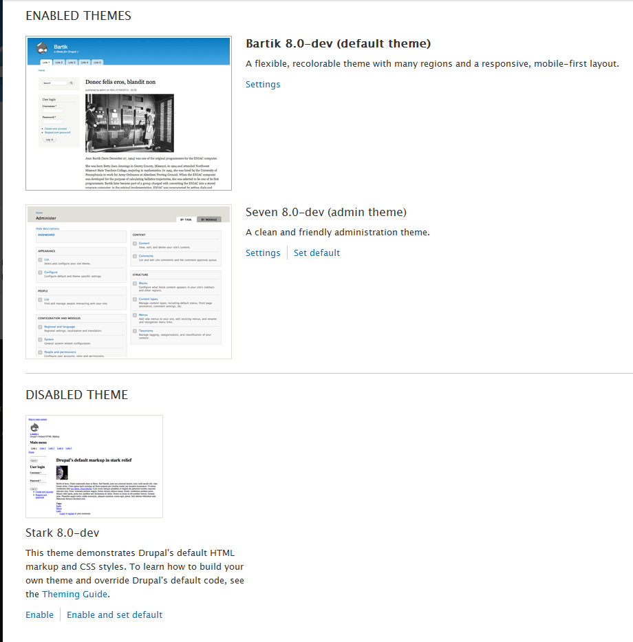 Enabling and Disabling themes in Drupal 8 Updated on August 16, 2021 by Scott Mitchell 1 Minutes, 42 Seconds to Read When working with themes in Drupal 8, you will want to know how to switch between themes that have been enabled. To that end, you will also need to know how to enable and disable them so they can be activated. This short article will guide you on how to do this to themes within your Drupal 8 installation. How to enable themes in Drupal 8 Log into your Drupal 8 administrative dashboard. Select Menu from the top menu bar. Next, click on Appearance from the secondary menu that appears. You are now taken to the main Appearance screen. This is a list of available themes. The enabled themes are listed at the top. Look to the section beneath entitiled Disabled Themes and find the theme you wish to enable. From there, you will see two options, click on the one that best suits your needs. Enable Enables the theme, but simply places in the list above. Does not set it as the active theme. Enable and set default Enables the theme and places in the list above. Sets it as the current active theme. In our example, we clicked Enable for the Stark theme. You can now see that it appears in the Enabled Theme list and can be activated at any time. How to disable themes in Drupal 8 Diasabling themes is a very straightforwrd process as demonstrated below Log into your Drupal 8 administrative dashboard. Select Menu from the top menu bar. Next, click on Appearance from the secondary menu that appears. You are now taken to the main Appearance screen. This is a list of available themes. The enabled themes are listed at the top. Look to the theme that you wish to disable and you will see the Disable link next to it. Click that to disable the theme. Note that you are unable to disable the Bartik and Seven themes. These are the two default themes so they are not available for disabling by Drupal 8. Once you have disabled your theme, it will now appear in the Disabled Themes section of the Appearance list. Share this Article Related Articles Finding 404 page not found errors in Drupal 7 Removing the site title in Drupal 8 Content Types in Drupal 8 Disabling user images for posts and comments in Drupal 8 How to add an image in Drupal 7 How to upload your custom logo in your Drupal 7 theme Setting custom logos in your Drupal 8 theme Fixing the “An unrecoverable error occurred” error in Drupal How to Make a Duplicate Drupal Site How to Install a New Theme in Drupal