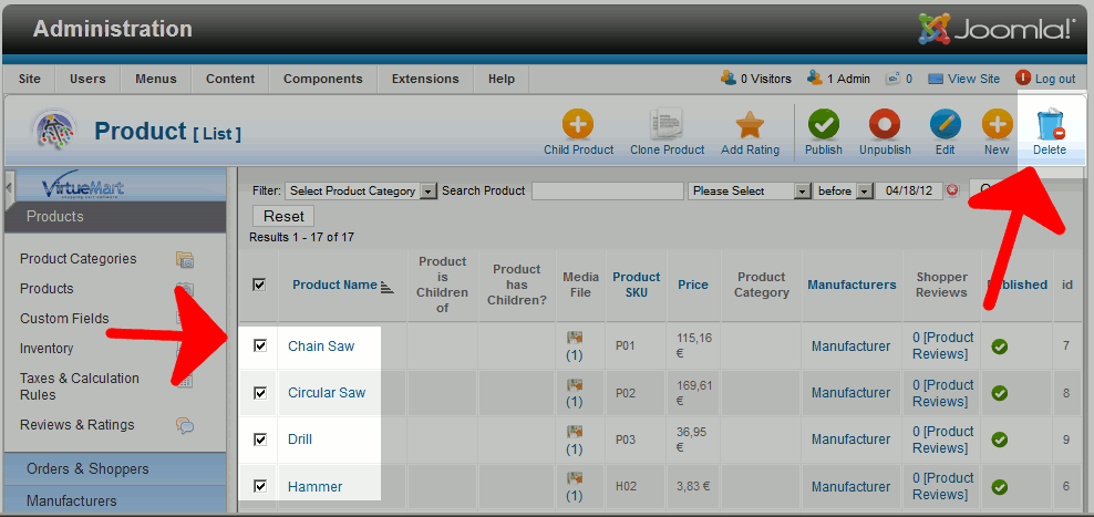 How to Delete Products in VirtueMart for Joomla 2.5 Updated on November 19, 2021 by Brad Markle 1 Minutes, 11 Seconds to Read Joomla 2.5 has reached its end of life as for 12/31/2014. Please be advised this may be a security risk to your website. You can view more information about the end of life here. In our last article, we showed you how to delete product categories in VirtueMart for Joomla 2.5. We are doing this because we are removing the test products and product categories that were included with the VirtureMart sample data. As you can see in the screenshot below, even though we deleting their categories, we still have a few sample products showing up. In this VirtueMart tutorial, we will show you how to delete products. How to delete products in VirtueMart: Log into your Joomla Dashboard In the top menu, hover over Components and then click VirtueMart Click the Products icon Place a check in the box next to each product that you want to delete. Then click Delete in the top right menu. Please note that when deleting products that have children, you first have to delete the children products first and then delete the parent products. If you try to delete a parent product first, you will receive an error message similar to: vmError: Attention product is parent, please delete the children firstProduct could not be deleted. After deleting products, you will see a message similar to:Product successfully deleted. When you visit your store again, you will no longer see any of the deleted products shown! Share this Article Related Articles How to Use the Free Mini Frontpage Extension for Joomla 4.0 How to Change a Joomla 2.5 User’s Email Address How to Configure Joomla 2.5 to Send Email Using SMTP How to Edit a Joomla 3 Template How to install Phoca Gallery for Joomla 2.5 Creating a Menu Item for your Joomla 3 Component Changing Email Settings in Joomla 3.1 Using the Redirect Manager in Joomla 3.1 How to add Bootstrap to a Joomla 3.1 Template How to Use Bootstrap 5.0 Alerts in Joomla 4.0
