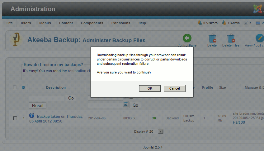 Joomla 2.5 backup – Downloading a copy of your Akeeba Backup Updated on August 16, 2021 by Brad Markle 1 Minutes, 9 Seconds to Read Joomla 2.5 has reached its end of life as for 12/31/2014. Please be advised this may be a security risk to your website. You can view more information about the end of life here. In our previous tutorial, we showed you how to create a backup of your Joomla 2.5 website using Akeeba Backup. In this tutorial, we’ll discuss a bit further on where that backup file is located so that you can download a copy of it. Where is the Joomla 2.5 backup file located? In the Akeeba backup configuration page, there is a setting labeled Output Directory. This setting controls where on the server your Joomla 2.5 backups will be stored. By default, they are stored in: administrator/components/com_akeeba/backup If you changed this setting, then your backups will be stored in the directory you specified. If you have not changed this setting, then your backups should be stored in administrator/components/com_akeeba/backup. How to download your backup files While the Akeeba Backup software allows you to download the backups directly from your Joomla admin, it does not recommend it. Instead, it gives this warning: Downloading backup files through your browser can result under certain circumstances to corrupt or partial downloads and subsequent restoration failure. Are you sure you want to continue? Based upon this warning, it would be best to use ftp to download this Joomla 2.5 backup file from your account. Share this Article Related Articles The Complete Guide to cPanel Backups How to Install Nextcloud on Ubuntu 18.04 LTS Protect an Archived Backup Backup Manager WHM Guide for VPS/Dedicated Servers How to Keep Regular Backups for Reseller Accounts Storing Your Backups with Amazon S3 via WHM How to use Google’s cache to restore a web page Scheduling cPanel Backups in WHM How to Create a Backup Using FTP How to Restore Backups from Amazon’s S3 Cloud Storage