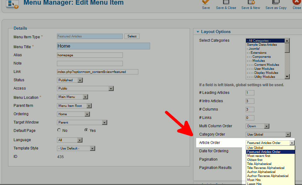 Changing the order of Featured Articles on your Joomla 2.5 Front Page Updated on November 19, 2021 by Brad Markle 1 Minutes, 19 Seconds to Read Joomla 2.5 has reached its end of life as for 12/31/2014. Please be advised this may be a security risk to your website. You can view more information about the end of life here. Featured articles in Joomla 2.5 are articles that show up on your Joomla 2.5 front page. Assigning an article as a featured article is easy to do, and in this Joomla 2.5 tutorial we’ll talk about how to adjust the ordering of featured articles on your front page. To change the order of featured articles on Joomla 2.5’s front page: Log into your Joomla Administrator backend In the top menu, hover over Content and click Featured Articles. Click the arrows under Ordering to adjust the Featured Articles order. Under the Ordering column, you should see blue and white arrows you can click to adjust the ordering of the Feature Articles. If you don’t see these arrows, click the Ordered header and they should show up. If you notice in the screenshot below, even though we adjusted the Featured Article order in Joomla 2.5, our front page does not show the articles in the order we want: You may need to adjust the Article Order setting on your Joomla 2.5 homepage menu item. To do this: In the top menu, hover over Menus and click Main Menu Click on your Home page Under layout options, you will then see an option labeled Article Order which you can adjust. To get our ordering to match the Featured Article Order, we used the following settings: Multi Column Order: AcrossCategory Order: No OrderArticle Order: Featured Articles OrderDate for Ordering: Use Global Share this Article Related Articles How to Use the Free Mini Frontpage Extension for Joomla 4.0 How to Change a Joomla 2.5 User’s Email Address How to Configure Joomla 2.5 to Send Email Using SMTP How to Edit a Joomla 3 Template How to install Phoca Gallery for Joomla 2.5 Creating a Menu Item for your Joomla 3 Component Changing Email Settings in Joomla 3.1 Using the Redirect Manager in Joomla 3.1 How to add Bootstrap to a Joomla 3.1 Template How to Use Bootstrap 5.0 Alerts in Joomla 4.0
