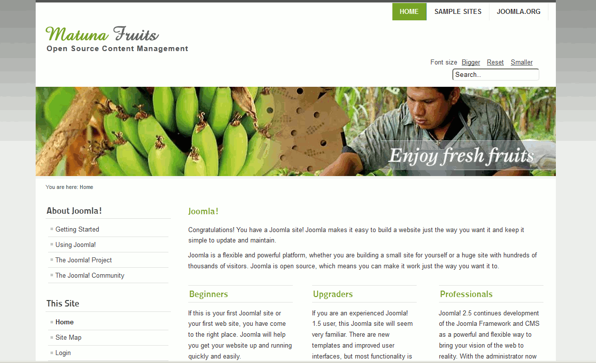 How to change your Joomla 2.5 Site Template Updated on November 19, 2021 by Brad Markle 0 Minutes, 46 Seconds to Read Joomla 2.5 has reached its end of life as for 12/31/2014. Please be advised this may be a security risk to your website. You can view more information about the end of life here. Your Joomla 2.5 template is what controls your website’s appearance. Changing your Joomla 2.5 template allows you to drastically change the look and feel of your website in a matter of minutes. To change your Joomla 2.5 Template: Log into your Joomla 2.5 Dashboard In the top menu, under Extensions click Template Manager Click the Star icon next to the Site Template that you would like to enable. The template currently being used will have a solid star listed under Default. Be aware that there are two types of templates, Site templates and Administrator templates. The Site templates affect what your website visitors see, while the Administrator templates change the look and feel of the Joomla 2.5 Dashboard. Congratulations, you have just changed your Joomla 2.5 Site Template! Before: After: Share this Article Related Articles How to Use the Free Mini Frontpage Extension for Joomla 4.0 How to Change a Joomla 2.5 User’s Email Address How to Configure Joomla 2.5 to Send Email Using SMTP How to Edit a Joomla 3 Template How to install Phoca Gallery for Joomla 2.5 Creating a Menu Item for your Joomla 3 Component Changing Email Settings in Joomla 3.1 Using the Redirect Manager in Joomla 3.1 How to add Bootstrap to a Joomla 3.1 Template How to Use Bootstrap 5.0 Alerts in Joomla 4.0