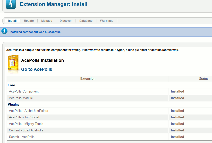 Joomla 2.5 Polls – Installing AcePolls Updated on November 19, 2021 by Brad Markle 0 Minutes, 40 Seconds to Read Joomla 2.5 has reached its end of life as for 12/31/2014. Please be advised this may be a security risk to your website. You can view more information about the end of life here. If you want a poll on your Joomla 2.5 website, you can add a poll using AcePolls. In this tutorial, we’ll walk you through the steps for installing AcePolls. To install AcePolls in Joomla 2.5: Visit this page and download ACEPOLLS FREE to your computer Log into your Joomla Dashboard In the top menu, hover over Extensions and click Extension Manager Under Upload Package File, click Browse. Select the file you just downloaded. Click the Upload & Install Button. You should see a success message stating that AcePolls has been installed successfully: Your next step will be to create a new poll in AcePolls. Share this Article Related Articles How to Use the Free Mini Frontpage Extension for Joomla 4.0 How to Change a Joomla 2.5 User’s Email Address How to Configure Joomla 2.5 to Send Email Using SMTP How to Edit a Joomla 3 Template How to install Phoca Gallery for Joomla 2.5 Creating a Menu Item for your Joomla 3 Component Changing Email Settings in Joomla 3.1 Using the Redirect Manager in Joomla 3.1 How to add Bootstrap to a Joomla 3.1 Template How to Use Bootstrap 5.0 Alerts in Joomla 4.0