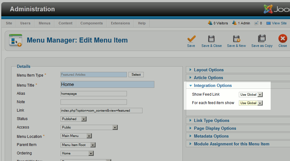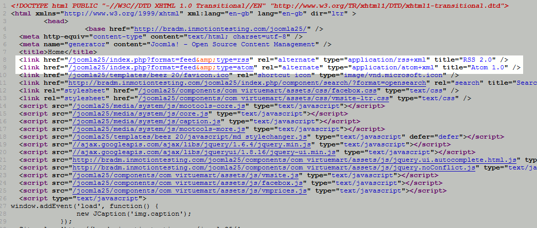Joomla 2.5 Featured Articles – RSS Integration Options Updated on November 19, 2021 by Brad Markle 1 Minutes, 33 Seconds to Read When creating a Joomla 2.5 featured articles menu item, there are quite a few options you can configure for the page. In this Joomla 2.5 tutorial, we’ll cover the Integration Options specifically, which relate to how RSS feeds are managed. How to access the Joomla 2.5 featured articles integration options: Log into your Joomla 2.5 dashboard In the top menu, hover over Menus and then click the menu that contains the featured articles menu item that you would like to change. From the list of menu items, click the featured articles menu item you would like to manage.On the next page, in the right menu you will find an Integration Options area. Show Feed Link The show feed link option toggles whether or not the page will include an rss feed link. Show Feed Link shown Show Feed Link hidden When the feed links are shown, they will look similar to: <link href=”/joomla25/index.php?format=feed&type=rss” rel=”alternate” type=”application/rss+xml” title=”RSS 2.0″ /> <link href=”/joomla25/index.php?format=feed&type=atom” rel=”alternate” type=”application/atom+xml” title=”Atom 1.0″ /> For each feed item show The For each feed item show is suppose to toggle whether your RSS feed shows the full text of the article or just the intro text. In our testing, this option appeared to work at first, but after further testing it stopped working. This may be a bug in Joomla 2.5 because there are some posts in the Joomla forums where other users have reported the problem. It could also not be working due to other configuration options, but in our thorough testing we were not able to get this option to work correctly. In the end, we’ve found this option to only show the intro text, and not the full text. Share this Article Related Articles How to Use the Free Mini Frontpage Extension for Joomla 4.0 How to Change a Joomla 2.5 User’s Email Address How to Configure Joomla 2.5 to Send Email Using SMTP How to Edit a Joomla 3 Template How to install Phoca Gallery for Joomla 2.5 Creating a Menu Item for your Joomla 3 Component Changing Email Settings in Joomla 3.1 Using the Redirect Manager in Joomla 3.1 How to add Bootstrap to a Joomla 3.1 Template How to Use Bootstrap 5.0 Alerts in Joomla 4.0