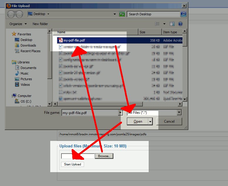 How to upload a file using the Joomla 2.5 Media Manager Updated on November 19, 2021 by Brad Markle 1 Minutes, 46 Seconds to Read Joomla 2.5 has reached its end of life as for 12/31/2014. Please be advised this may be a security risk to your website. You can view more information about the end of life here. If you need to upload images to your Joomla 2.5 website for use within an article, it’s easiest to upload the images as you’re writing the article. What do you do however when you need to upload something else other than an image? For example, how do you upload a pdf file and give someone a link to that file? In this Joomla 2.5 tutorial, we’ll show you how to upload files (other than images) using your Joomla 2.5 media manager. We’ll also show you how to find the URL to that file so that you can link to it. In this article, we’re specifically focusing on a .pdf file. Keep in mind however that these steps will apply to all document types, such as .docx, .xlsx, and .pptx. To upload a file using the Joomla 2.5 media manager: Log into your Joomla 2.5 admin In the top menu, hover over Content and then click Media Manager In the left menu under Media Folders, navigate to the folder where you want to upload the file to by clicking on the individual folders. If you need to create a new folder, in the right side of the page enter a name for the new folder and then click Create Folder. Upload your file After navigating to the folder where you want to upload your file to, under Upload Files click the Browse button. Find the file on your computer, select it by clicking on it, and then click Open. Finally click Start Upload. After the file has been uploaded, you will see a message similar to: Upload Complete: /pdfs/my-pdf-file.pdf If you need to link to this file, you need to find the path to it. The path is actually given to you after uploading the file. In our case, the path was /pdfs/my-pdf-file.pdf. The link to your new file will be: Your Joomla site’s URL + /images + your uploaded file’s path:https://example.com/images/pdfs/my-pdf-file.pdf Share this Article Related Articles How to Use the Free Mini Frontpage Extension for Joomla 4.0 How to Change a Joomla 2.5 User’s Email Address How to Configure Joomla 2.5 to Send Email Using SMTP How to Edit a Joomla 3 Template How to install Phoca Gallery for Joomla 2.5 Creating a Menu Item for your Joomla 3 Component Changing Email Settings in Joomla 3.1 Using the Redirect Manager in Joomla 3.1 How to add Bootstrap to a Joomla 3.1 Template How to Use Bootstrap 5.0 Alerts in Joomla 4.0
