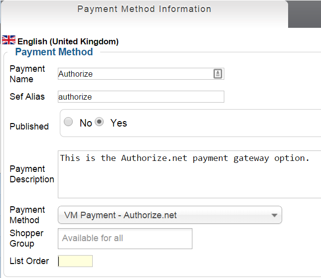 7. Click Save to complete the Authorize.net setup in VirtueMart.