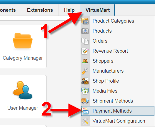2. In the navigation menu, move your mouse over VirtueMart(1) and click Payment Methods(2).