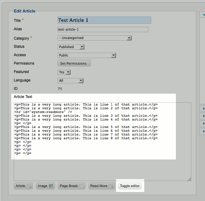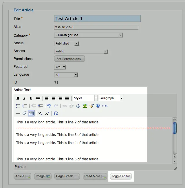 Using the WYSIWYG and HTML editor in Joomla 2.5 Updated on August 16, 2021 by Brad Markle 1 Minutes, 9 Seconds to Read Joomla 2.5 has reached its end of life as for 12/31/2014. Please be advised this may be a security risk to your website. You can view more information about the end of life here. When writing articles in Joomla 2.5, you can use either the WYSIWYG editor or you can edit the HTML of the article directly. The HTML editor allows you to view all of the HTML code that makes up an article, where as the WYSIWYG editor hides this code and in essence allows you to preview the article before publishing it. The WYSIWYG editor also makes it easier to insert special characters into your articles, such as the copyright character. While the HTML editor is generally used by advanced users when working with articles, those same advanced users use the WYSIWYG editor just as often (if not more). How to toggle between the HTML editor and the WYSIWYG editor in Joomla 2.5 Begin writing a new article or open for edit any article Under the article editor, click the button labeled Toggle editor. If you in the WYSIWYG mode you will see the HTML view appear, and vice versa. WYSIWYG Mode HTML editor Have you ever tried to edit an article only to find out it was locked? Now that you know how to switch editors, you may want to read our previous article to learn more about locked articles in Joomla 2.5. Share this Article Related Articles How to Use the Free Mini Frontpage Extension for Joomla 4.0 How to Change a Joomla 2.5 User’s Email Address How to Configure Joomla 2.5 to Send Email Using SMTP How to Edit a Joomla 3 Template How to install Phoca Gallery for Joomla 2.5 Creating a Menu Item for your Joomla 3 Component Changing Email Settings in Joomla 3.1 Using the Redirect Manager in Joomla 3.1 How to add Bootstrap to a Joomla 3.1 Template How to Use Bootstrap 5.0 Alerts in Joomla 4.0