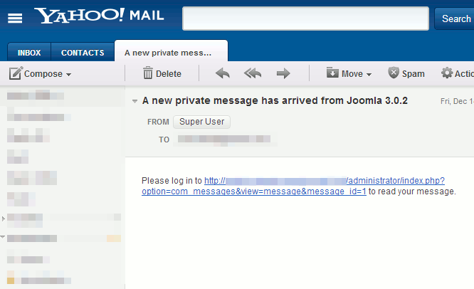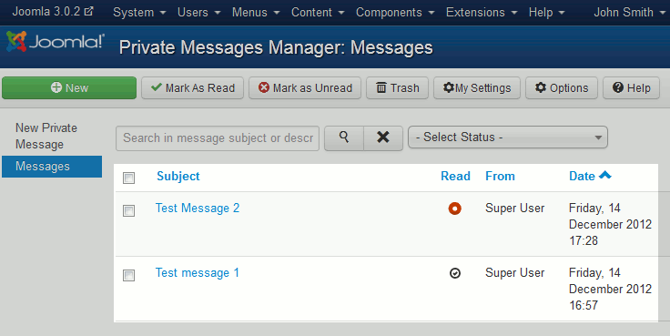 Joomla 3.1 Messaging Tutorial Updated on September 20, 2022 by Brad Markle 2 Minutes, 52 Seconds to Read This guide will show you how to send, read, and configure the messaging component in Joomla. Joomla 3.0 includes a component called Messaging. This Messaging extension allows site Administrators and Super Users to send and receive private messages from within the Joomla administrative dashboard. How to send a New Private Message Log into your Joomla 3.0 admin dashboardIn the top menu, click Components, hover over Messaging, and then click New Private Message.You will see three fields: Recipient, Subject, and Message. Fill out the details of your message and then click Send.Click the icon of a person next to Recipient, then click on the Name of the person you would like to send a private message to.Please note that private messages can only be sent to Administrators and Super Users!Type in a subject for your message, type the message itself, and then click the Send button in the top left of the page.After your new message has been sentAfter sending a new message, the user will be sent an email to notify them of a new message. This email will not contain the message itself, but instead a link they can click on to view the message. This email will only be sent if the user has the notification of new message option set (see the info on configuration options at the bottom of this tutorial). Reading Private Messages How do I know if I have a new private message? Besides email notifications (if you haven’t disabled the setting), if you have a new private message, you’ll see a notification of new messages in the admin dashboard footer. For example, if you look to the screenshot to the right, you can see towards the bottom that there is a number 1 with a mail icon next to it – notifiying you that you one one new message. Clicking this notification will bring you to a listing of all your messages. How to read your Private Messages Log into your Joomla 3.0 admin dashboardIn the top menu, click Components, hover over Messaging, and then click Read Private Messages. If you have any private messages, you will see them in a list on this page. Joomla will show you the subject of the message, whether it has been read or is unread, who it was sent from, and when it was sent.To read a message, click on the subject of the message.To reply to a private message that you are currently reading, click the Reply button in the top left of the page. On the next page, type in a message for your reply, and then click Send in the top left of the page. Configuring Messaging Options Each user has a few messaging options that they can configure just for themselves. Again, these are not global options, so if a user changes a setting described below, it will only affect their account, no one else. Log into your Joomla 3.0 admin dashboardIn the top menu, click Components and then click MessagingClick the My Settings button towards the top of the pageAdjust the settings as you need, and then click the Save & Close button in the top left. We’ll describe each of the settings below: Lock Inbox Lock your private message inbox. default: No Email New Messages Email me when a new private message arrives. default: Yes Auto-purge Messages (days) Automatically purge private messages after the given number of days. default: 7 Share this Article Related Articles How to Use the Free Mini Frontpage Extension for Joomla 4.0 How to Change a Joomla 2.5 User’s Email Address How to Configure Joomla 2.5 to Send Email Using SMTP How to Edit a Joomla 3 Template How to install Phoca Gallery for Joomla 2.5 Creating a Menu Item for your Joomla 3 Component Changing Email Settings in Joomla 3.1 Using the Redirect Manager in Joomla 3.1 How to add Bootstrap to a Joomla 3.1 Template How to Use Bootstrap 5.0 Alerts in Joomla 4.0