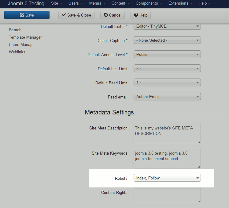 Setting Index and Follow settings in Joomla 3.1 Updated on November 19, 2021 by Brad Markle 1 Minutes, 0 Seconds to Read The next Joomla 3.0 Metadata setting we will look at is the Robots setting. This setting will allow you to set the meta robots tag, which controls how search engines will crawl and index each of your pages. Example meta robots tag: <meta name="robots" content="noindex, follow" /> To change your Robots settings in Joomla 3.0 Log into the Joomla 3.0 admin dashboard In the left menu, click the Global Configuration link Under the Site tab, find the Robots setting (refer to the screenshot at the top of this page) The following settings are available: Option Resulting meta tag Index, Follow No robots meta tag is added. No index, follow <meta name="robots" content="noindex, follow" /> Index, No follow <meta name="robots" content="index, nofollow" /> No index, no follow <meta name="robots" content="noindex, nofollow" /> What does each setting mean? Value Result index Tells a search engine whether or not you want them to index the contents of this page. follow Tells a search engine whether or not you want them to follow and crawl the links on this page. After making your desired change, click the Save button at the top left of the page. Share this Article Related Articles How to Use the Free Mini Frontpage Extension for Joomla 4.0 How to Change a Joomla 2.5 User’s Email Address How to Configure Joomla 2.5 to Send Email Using SMTP How to Edit a Joomla 3 Template How to install Phoca Gallery for Joomla 2.5 Creating a Menu Item for your Joomla 3 Component Changing Email Settings in Joomla 3.1 Using the Redirect Manager in Joomla 3.1 How to add Bootstrap to a Joomla 3.1 Template How to Use Bootstrap 5.0 Alerts in Joomla 4.0