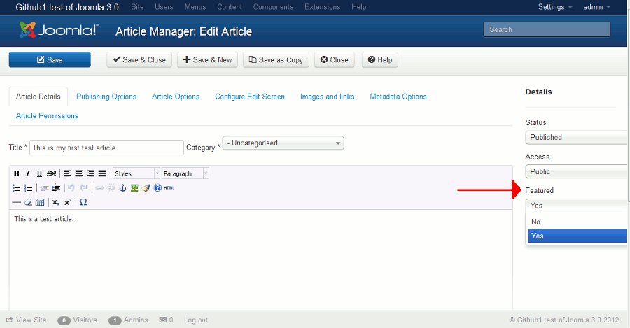 How to feature an article on your Joomla 3.1 homepage Updated on November 19, 2021 by Brad Markle 0 Minutes, 51 Seconds to Read After you have creating your first article, you can set it as a featured article so you can see it on your Joomla 3.0 homepage. The steps below will show you how to set an article as featured after you have already published, but you can just as easily make this change while you are initially writing the article. To feature an article in Joomla 3.0: Log into your Joomla 3.0 admin dashboard In the top menu, click Content and then click Article Manager From here you can: Open the article for edit Click the Featured star In the list of articles, click the article title that you would like to edit. In the right menu, under Details, set Featured to Yes. Then click Save in the top left menu. In the list of articles, find the icon of a star (under the Featured column) and click it. The star will change from hollow to a blue star. When you visit your Joomla 3.0 homepage now, you should see your featured article display! Before After Share this Article Related Articles How to Use the Free Mini Frontpage Extension for Joomla 4.0 How to Change a Joomla 2.5 User’s Email Address How to Configure Joomla 2.5 to Send Email Using SMTP How to Edit a Joomla 3 Template How to install Phoca Gallery for Joomla 2.5 Creating a Menu Item for your Joomla 3 Component Changing Email Settings in Joomla 3.1 Using the Redirect Manager in Joomla 3.1 How to add Bootstrap to a Joomla 3.1 Template How to Use Bootstrap 5.0 Alerts in Joomla 4.0