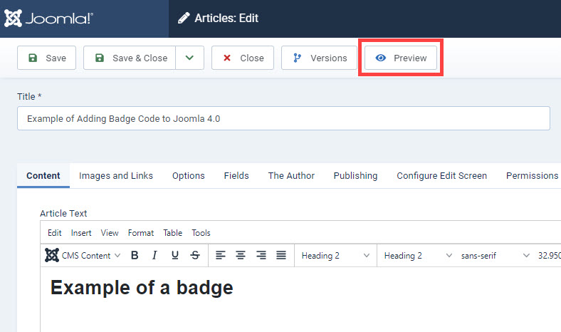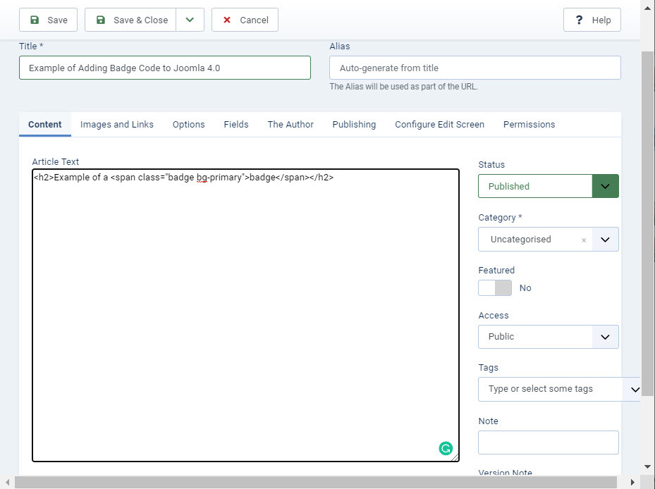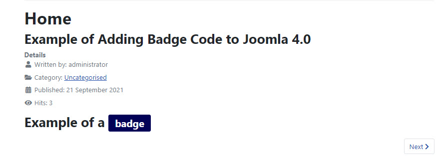Badges with BootStrap 5.0 in Joomla 4.0 Updated on November 22, 2021 by InMotion Hosting Contributor 7 Minutes, 24 Seconds to Read Badges are a way to add a little bit of emphasis to your text content. You can easily use them wherever you have text in your Joomla content. This article will briefly show you how to use badges through Bootstrap 5.0 in your Joomla 4.0 content. What is Bootstrap? Bootstrap is an HTML, CSS, and JS framework used to build responsive websites that are designed to work with mobile devices. Bootstrap 5.0 is included with the Joomla 4.0 installation! What are Badges?Adding the Code in the EditorBadge SizesDifferent Badge ColorsBadge Text – Light or DarkBadges in ButtonsPositioning a Badge in a ButtonPill Shaped BadgesUsing Badge Code with Assistive Technologies Looking for a new server to host your Joomla site? Look no further than InMotion’s VPS server hosting solutions! You’ll find a performance-oriented server made for your budget! What are Badges? A badge is simply a highlighted piece of text. You can use it to emphasize a comment or point, or just to make the text appear a little different from what surrounds it. You can also use badges as part of a counter, and position where the badge will be displayed, or change the shape and color of the badge. Here are examples of all the badge types in this article: Text highlighted with a badge A number highlighted with a badge in button Button with badge positioned in the top right corner Button with badge positioned in the top right corner – no text Pill shaped badge Adding the Code in the Editor The code to create a badge is very simple. Follow the steps below to add the code in the Joomla editor. Anytime you’re using bootstrap code, you will be using the editor with these steps to add it: Login to the Joomla Administrator.Open an existing article or create a new one.When the editor is open, click on the Toggle button in the bottom right corner.Get the code. In this case, you can you can copy the code below. <h2>Example of a <span class="badge bg-primary">badge</span></h2>When you have the code in the editor, click on the Save button at the top of the editor. This will save your entries in the editor. Next, click on the Preview button at the top of the editor. Choose to open it in a new tab.The preview will let you see how the code will appear when the article is published. Here’s an example of the preview of the article: Badge Sizes The code used in the example above shows an example of a “primary-badge” with text set as <h2> (title text). You can vary the size of the badge using different “h” tags as long as you wrap the span code with the “h” tag that you wish to use. For example: <h1>The text and <span class="badge bg-info">badge</span> are affected by the tag.</h1> This code will appear like this: You can see that both the text and the badge are sized per the “h” tag. You can change the size of the badge using “h” tags from h1 (largest) to h6 (smallest). Different Badge Colors There are 8 main colors that you can change the badge colors to using a “bg” option. “BG” stands for Background. This is a list of all the colors that are a part of the badge code: <span class="badge bg-primary">Badge Primary</span> <span class="badge bg-secondary">Badge Secondary</span> <span class="badge bg-success">Badge Success</span> <span class="badge bg-danger">Badge Danger</span> <span class="badge bg-warning text-dark">Badge Warning</span> <span class="badge bg-info text-dark">Badge Primary</span> <span class="badge bg-light text-dark">Badge Light</span> <span class="badge bg-dark">Badge Dark</span> The resulting code will show you all of the badge colors: Badge Text – Light or Dark You can easily change the color of the badge and the badge text. You will want to change the badge text depending on the color that’s being displayed for the badge. For example, if your badge color is light, then you will want the text in the badge to be dark so that it can be more easily read. <h2><span class="badge bg-light text-dark">Light Badge with Dark text</span></h2> This code will show how the badge is a lighter color and the text is set to be dark: The badge uses white text by default if you do not set “text-dark” in the code. Badges in Buttons <button type="button" class="btn btn-success"> Notifications <span class="badge bg-warning">5</span> </button> Badges can also be used to highlight text in a button. For example, they are often used to highlight a count. When you add the code to the editor and then preview it, it will look like this: Positioning the Badge in a Button When you position a badge in a button, you are using the button code, position code, and badge code. For the sake of simplicity, it’s easiest to simply copy the provided code. If you want to learn more about using the class position in Bootstrap 5, then please see their Position documentation. Here is the code to show a count for a notification in the top right corner. <button type="button" class="btn btn-primary position-relative"> Inbox <span class="position-absolute top-0 start-100 translate-middle badge rounded-pill bg-danger"> 99+ </span> </button> If we go through the code line-by-line, you will see: The first line is the button code – it includes a class to define the button color and position“Inbox” is the text inside the buttonThe span code includes the position of the bage, its centering (“translate-middle”), the shape of the badge and the color of the badge.“99+” is the content of the badgeThe last lines are simply closing the span and button code You can see the button and how it is displayed with the badge in the screenshot above. This is a default example, but you also use this type of badge to highlight the number of warnings or highlight a value with a percentage or even some text. The use of positioned badges is limited by your needs and imagination! Positioned badge with no text You can also 