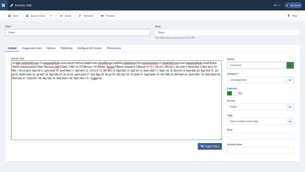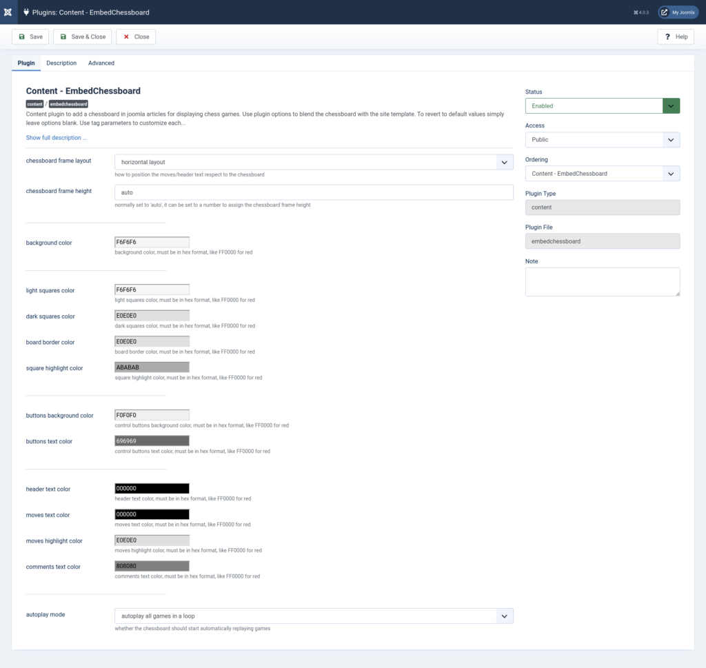 EmbedChessboard Joomla Plugin Updated on October 26, 2023 by InMotion Hosting Contributor 2 Minutes, 2 Seconds to Read Do you ever need a way to show a series of chess moves in your blog? EmbedChessboard allows you to embed chess games on websites with the Portable Game Notation (PGN) format, easy to comprehend for novice and grandmaster level players alike. Using EmbedChessboard Follow the “Download” link at https://extensions.joomla.org/extension/embedchessboard/. As of September 2021 you’ll be redirected to the SourceForge page. Select “embedchessboard-joomla-plugin-X.XX.XX.zip” to download the Joomla plugin. Below are checksums for embedchessboard-joomla-plugin-3.05.00.zip. We recommend comparing the checksum of your downloaded file to the results below to ensure your file is not corrupted or malicious. You can use the terminal or VirusTotal.com.SHA256SUM – 07f5b2415ac289e89d235dacc7dc530590747e6d71166c8fb78d00acd5697452SHA512SUM –69c17d6e7f1315f0deaf5e41d61e8a1f589430f830257e4baaa1d8c0c806971e3a358a2e233a4db7b30ba209eda942121ac67103629b297f6e6d511bd3c2c105MD5SUM –bdd9c9cd2e3efe029b4a8440250e1760RIPEMD160 –8b73e677b71043859aa31dc5a07f3faa75f361a0 Log into your Joomla administrator dashboard (e.g. https://example.com/administrator). On the left, select “System.” Under “Install,” select “Extensions.” Select “Or browse for file” and the plugin zip file. You’ll see the following notification: On the left, select “System.” Select “Plugins.” Select “Content – EmbedChessboard.” On the right, select the Status drop-down menu and “Enabled.” Set the default chessboard frame layout to show move notation beside or under the chess board. This can be changed manually when coding an EmbedChessboard setup. Set the default EmbedChessboard frame height. This can also be overwritten. Customize the color of the EmbedChessboard background, board squares, navigation buttons, and text in hex format. Click the text field to use the color graph. Set the default settings for automatically playing chess games. This too can be overwritten per chess board. Select the “Description” tab for sample code. You can copy this code to get started as we did below. Select the “Advanced” tab to add custom CSS. Save changes. Create a Joomla article. Develop the PGN code for your chess game. The code block includes all custom parameters available and the developer’s example chess game. Below is the final result of the code block above. Learn more about chess notation at https://www.chess.com/article/view/chess-notation. Share this Article InMotion Hosting Contributor Content Writer InMotion Hosting contributors are highly knowledgeable individuals who create relevant content on new trends and troubleshooting techniques to help you achieve your online goals! More Articles by InMotion Hosting Related Articles How to Use the Free Mini Frontpage Extension for Joomla 4.0 How to Use Bootstrap 5.0 Alerts in Joomla 4.0 Joomla 4.0 2FA with Yubikey Setup Learning About the Menu Interface in Joomla 4.0 Manually Install Joomla 4.0 Easy Joomla 4.0 Backups using Softaculous How to Enable Caching in Joomla 4.0 How to Trash, Unpublish, and Hide Menu Items in Joomla 4.0 How to Add and Remove Menu Items in Joomla 4.0 EmbedChessboard Joomla Plugin