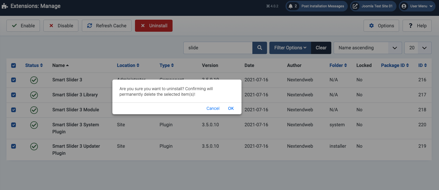 Joomla 4 Remove Extension Updated on September 3, 2021 by InMotion Hosting Contributor 1 Minutes, 40 Seconds to Read Joomla 4 was recently released. If you’re like us, then you probably spent a lot of time exploring the latest extensions included with Joomla 4, playing around with them to see what’s new and what’s different. The thing is, it’s never a good idea to leave a bunch of extensions installed that you aren’t using! Even the best of extensions can cause problems if they conflict with other extensions, or if the developer stops updating them. Prevent any problems by uninstalling extensions you do not need anymore. Things to Keep in Mind when Removing Joomla 4 ExtensionsJoomla 4 Remove Extension Things to Keep in Mind when Removing Joomla 4 Extensions There are numerous extension types in Joomla. Extensions vary in functionality — for example Components add extra functionality and programming to your site, while Templates will affect appearance and presentation. Any type of extension can be uninstalled with this method. That said, be careful! Uninstalling an extension will permanently delete the extension files. You should be absolutely sure that you want to completely remove an extension before you uninstall it. It can be a good idea to first Disable the extensions you plan to uninstall and check your site to make sure nothing unexpected happens! Just follow the steps below, but choose Disable instead of Uninstall. Joomla 4 Remove Extension We’ll be uninstalling the Smart Slider extension as an example, but the procedure should work similarly for any extension. Login to your Joomla Dashboard.Click on System in the left-side menu.Under Manage, click on Extensions.Use the Search box to narrow down the results to the extension or extensions you are looking for. Many components or modules will actually include multiple extensions, so you may need to uninstall a few at once as seen here.Check the boxes next to all of the extensions you wish to uninstall and click the Uninstall button above.Confirm that you want to uninstall the extensions, completely deleting them.You will see a confirmation screen, confirming that the extensions have been uninstalled. Share this Article InMotion Hosting Contributor Content Writer InMotion Hosting contributors are highly knowledgeable individuals who create relevant content on new trends and troubleshooting techniques to help you achieve your online goals! More Articles by InMotion Hosting Related Articles How to Use the Free Mini Frontpage Extension for Joomla 4.0 How to Use Bootstrap 5.0 Alerts in Joomla 4.0 Joomla 4.0 2FA with Yubikey Setup Learning About the Menu Interface in Joomla 4.0 Manually Install Joomla 4.0 Easy Joomla 4.0 Backups using Softaculous How to Enable Caching in Joomla 4.0 How to Trash, Unpublish, and Hide Menu Items in Joomla 4.0 How to Add and Remove Menu Items in Joomla 4.0 EmbedChessboard Joomla Plugin