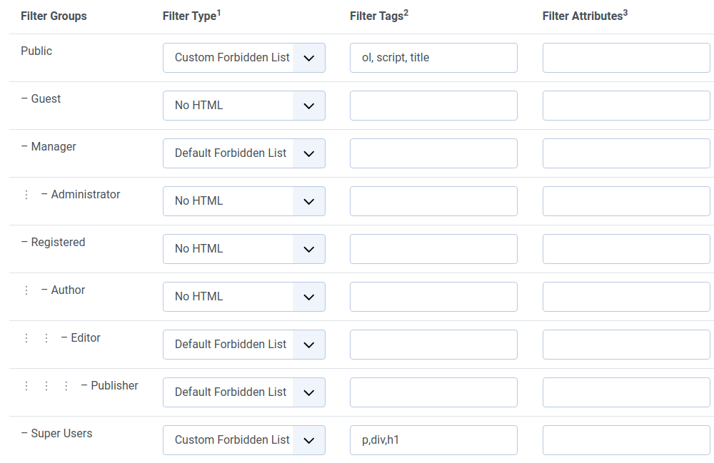 Using Text Filters in Joomla 4 Updated on September 15, 2021 by InMotion Hosting Contributor 1 Minutes, 42 Seconds to Read Joomla 4 text filters can be used to allow or limit what HTML tags or attributes groups can use within the text editors. Joomla includes some default filter settings that are typically adequate for most situations. But, there may be times when you want to block or allow additional HTML tags or attributes. For example, you may have discovered that a specific tag does not work well with your CSS and you want to block people from using it. This guide will explain how to use Joomla Text Filters to limit or allow HTML tags and attributes in Joomla. Setting Joomla 4 Text Filters Login to the Joomla Admin Panel.Click System then Global Configuration.Click the Text Filters tab.You will then see a list of all the Filter Groups you can modify the setting for. Default groups are: Public, Guest, Manager, Administrator, Registered, Author, Editor, Publisher, and Super Users.Click the drop-down box under Filter Type to choose your preferred filter option, then fill in the Filter Tags and Filter Attributes if needed. Below is a description of the available options. Click the Save & Close button when you are done. Text Filter OptionDescriptionDefault Forbidden ListAccording to Joomla this list blocks the following tags: ‘applet’, ‘body’, ‘bgsound’, ‘base’, ‘basefont’, ‘canvas’, ’embed’, ‘frame’, ‘frameset’, ‘head’, ‘html’, ‘id’, ‘iframe’, ‘ilayer’, ‘layer’, ‘link’, ‘meta’, ‘name’, ‘object’, ‘script’, ‘style’, ‘title’, ‘xml’Custom Forbidden ListChoosing this will only block items listed in the Filter Tags and Filter Attributes fields to the right. Allowed ListThis option will block any Filter Tags or Filter Attributes that are not listed in the fields to the right.No HTMLSelect this option to block all HTML for this group.No FilteringThis will allow the selected group to use all tags and attributes.This table describes the Joomla 4 Text Filter options Now that you know all about Joomla 4 Text Filters, you can control what each group is allowed to include in their content. Check out our Joomla 4 section for more great guides to help you build a successful website. Share this Article IC InMotion Hosting Contributor Content Writer InMotion Hosting contributors are highly knowledgeable individuals who create relevant content on new trends and troubleshooting techniques to help you achieve your online goals! More Articles by InMotion Hosting Related Articles How to Use the Free Mini Frontpage Extension for Joomla 4.0 How to Use Bootstrap 5.0 Alerts in Joomla 4.0 Joomla 4.0 2FA with Yubikey Setup Learning About the Menu Interface in Joomla 4.0 Manually Install Joomla 4.0 Easy Joomla 4.0 Backups using Softaculous How to Enable Caching in Joomla 4.0 How to Trash, Unpublish, and Hide Menu Items in Joomla 4.0 How to Add and Remove Menu Items in Joomla 4.0 EmbedChessboard Joomla Plugin