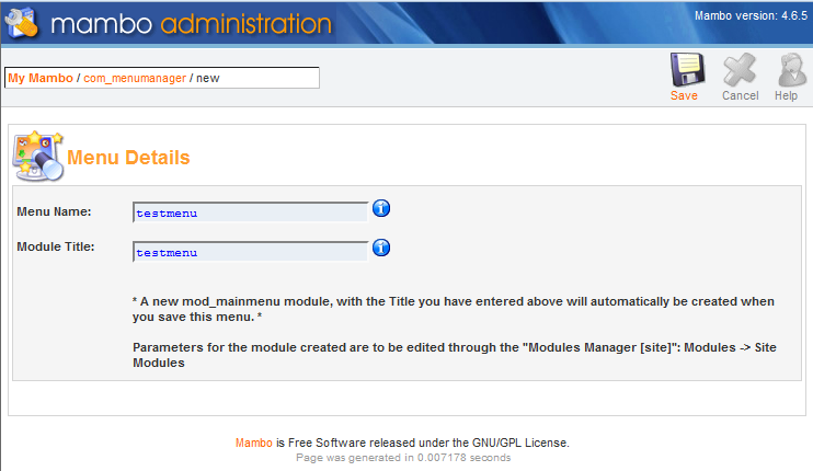 How to create a new menu in Mambo Updated on August 16, 2021 by Scott Mitchell 1 Minutes, 45 Seconds to Read When working within the Mambo application, you will discover there are several premade menus. You can also create your own custom menu for use on your site. Below are the instructions for creating a new menu for your Mambo site within the administration back office. Creating a new menu in Mambo Log into your Mambo admin interface This leads you to the main admin area, hover over the Menu in the top menu bar and click on the Menu Manager option from the dropdown. This leads you to a list of existing menus. To create a new one, click on the Newicon located in the upper right corner. You are now on the menu creation screen. Enter the Menu Name and Module Title and click on the Save icon in the upper right. You are brought back to the menu list. Find your new menu and click on the Menu Itemsicon to the right. This is the menu item screen that displays the existing menu items for your menu. Currently there are none for your new menu. Click the Edit button at the upper right to begin adding items. On the New Menu Item screen, select a radio button for the type of menu link you want to create then click on the Next button in the upper right corner. You will be taken to a page specific to the type of content you selected. Be sure to name the content. In our example, we named it ‘testlink’. Click the Save icon once finished adjusting the parameters to your liking. You will be returned to the Menu Manager screen for your new menu and will see the new menu item in the list. Repeat the process for as many items as you wish to add. Now you know how to create new menus in the Mambo application. These are not automatically displayed on the screen, however. If you wish to learn how to display the menu on your site, check out our article on Activating a menu for display in Mambo. Share this Article Related Articles Enable / Disable User Registration in Mambo How to Create a New Page in Mambo Adding an Image to a Page in Mambo How to change the Admin password for Mambo Installing Google Analytics in Mambo How to configure SMTP in Mambo How to Install Mambo through Softaculous How to log into your Mambo admin dashboard How to install and activate a new template in Mambo Using Captcha in Mambo