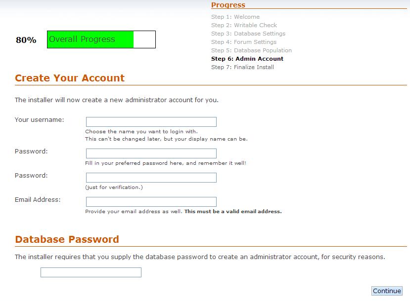 How to manually install SMF Updated on August 16, 2021 by Scott Mitchell 4 Minutes, 33 Seconds to Read In this SMF introductory installation tutorial, we will demonstrate how to install the Simple Machine Forums (SMF) program manually. A manual installation means installing the program without the help of third party installer programs. This typically takes more steps than using installer programs such as Softaculous. Below are the steps to help you get started. Before you begin, make sure you have downloaded the latest version of SMF to your local computer. Database Setup Log into your cpanel Find the Databases category and click on the MySQL Databases icon to enter the database creation screen. In this screen, choose a database name and enter it on the New Database field. Click the Create Database button to complete the database creation. Once you get the success message, click the Go Back link to return to the database creation page. Now you will need to create a database user for the database you just created. Scroll down to the MySQL Users section. Enter a username at the Username field. Note that the prefix to the username will always be your cpanel username. In this example, we named the user the same as the database name, which is inmoti6_smf. Enter a password of your own design or use the password generator for ideas. Once you have entered the password in both password fields, click the Create User button to finish generating the user. Again, you will get a user creation success message. Click the Go Back link to retun once again to the Database creation page. Now, we want to assign the user to the database. Scroll down to the Add User To Database section where you will see two fields: User and Database. Use the dropdowns to select the username to assign to your desired database. Click the Add button to add the user to the database. You are taken to a privileges screen. Click on the All Privileges checkbox to add them to the user and click on the Make Changes button at the bottom to save them. Click the Go Back link once you get the success message and you have finished creating the database for your SMF manual installation. Uploading SMF Files To Your Host Now you will need to upload the SMF zip package to your host. This part of the article assumes you are using a host with cPanel. Log into your cpanel Find the Files category and click on the File Manager icon. From here, you will be given a popup box to select the area you want to enter. Select the domain you want to upload your phpBB program into. As we are using a subdomain named smf.inmotiontesting.com. Click the Go button once you have selected the proper destination. You are now in the File Manager. Click on the Upload tool found along the top row of icons. This will take you to the file upload screen. Use the Browse button on this screen to locate your SMF ZIP file on your local computer. Once uploaded, click on the Back button in the middle of the screen. From here you will see the ZIP file on the page. Click it to highlight it and select the Extract tool from the list of icons across the top of the page. A popup will appear asking you to confirm or change the destination folder. As we are using the subdomain as our home folder for phpbb, simply click Extract File(s). The program has now been uploaded and extracted. We can now proceed to the next step of the install. Install The Program From The Domain Visit the domain you extracted the program files to. It should redirect you to the install page. For example: smf.inmotiontesting.com redirects to smf.inmotiontesting.com/install.php The first page is an introduction to the installation process. To begin, click on the Continue button in the lower right corner. The next page goes over database settings. There are several fields here that deal with connecting to the database. Once you have entered the information, click Continue. Database Type This may change depending on your host. Server Name If your database is on the same server as your account, you will use ‘localhost’, otherwise this will be the IP address or domain name of the database server. Username Username for the database you created earlier. Password Password for the database user. Database Name Name of the database you created earlier. Table Prefix Unless you have a custom setup, you can leave this with the default smf_. Next we have the Forum Settings. These are customizable settings for your Forum. If you are unsure of any custom settings you may need, simply leave the default settings in place. Click Continue when you are ready to movet to the next step. This page is a confirmation that the database tables were created and populated with beginning data. There are no options on this page so click Continue when you are ready to move on. Now it is time to create an administrative account for the forums. Once all information is entered here, click Continue when you are ready for the final step. This is the last step congratulating you on the installation completion. Be sure to click on the checkbox entitled Click here to delete this install.php file now. (doesn’t work on all servers.) for security purposes. This should delete your install.php file to prevent anyone from breaking into the site. Share this Article Related Articles Creating a new user in SMF 2.0 Changing a user’s password in SMF 2.0 What Is a Wiki? Editing the Footer in MediaWiki How to insert images into MediaWiki Managing passwords and usernames in MediaWiki How to make basic changes to mediawiki skins How to manually install SMF How to install SMF 2.0 with Softaculous How to log into your SMF admin dashboard