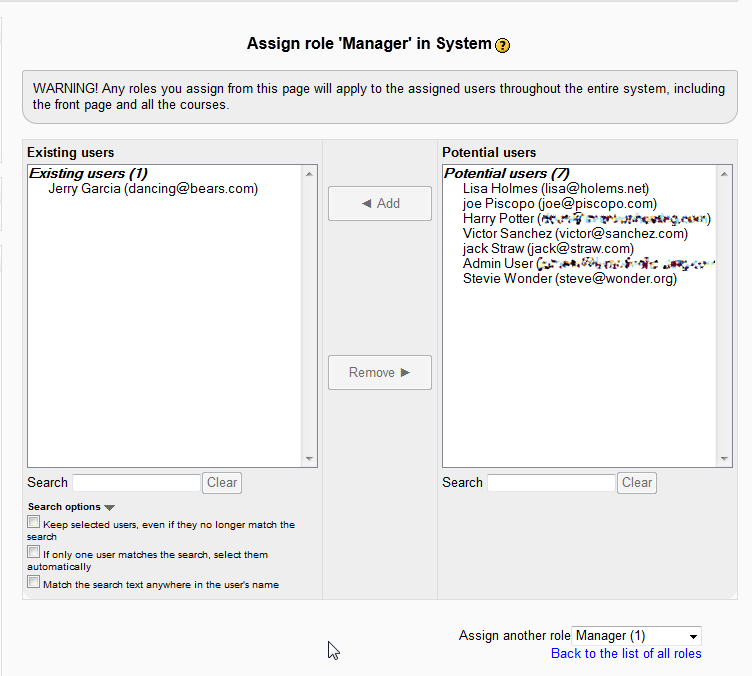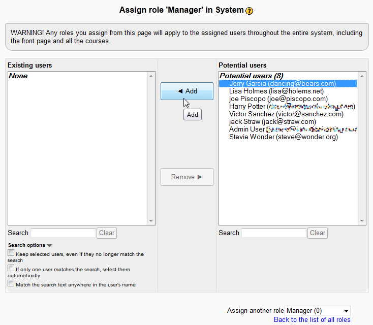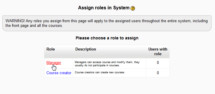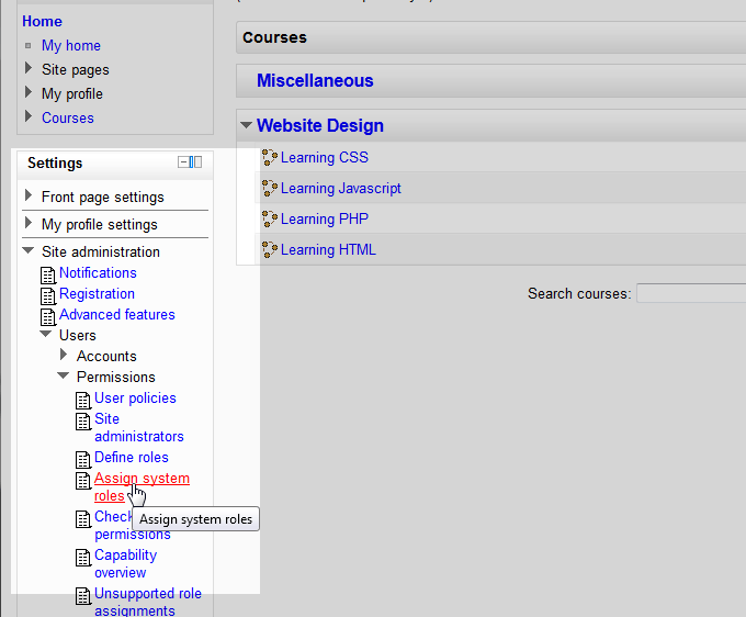 Assigning system roles in Moodle Updated on August 16, 2021 by InMotion Hosting Contributor 1 Minutes, 19 Seconds to Read In the previous tutorial, we learned about Defining Roles in Moodle. Once roles are defined, the users can be set to those specific roles. In this tutorial, we will learn how to assign system roles in Moodle 2.3. System roles are permissions to specific uses that are accessible throughout the entire Moodle Site. Assigning system roles to users Log into the Moodle Dashboard In the Settings section of Moodle, navigate to Site administration > Users > Permissions > Assign system roles. Important! Keep in mind that Editing must be turned on in the Settings section in order to edit any of these options. The Assign roles in System page should load. Here the roles can be assigned to particular users. In this tutorial, the Manager role will be assigned to a user. Click the Manager link. Note! Moodle will give the following warning: “WARNING! Any roles you assign from this page will apply to the assigned users throughout the entire system, including the front page and all the courses.” Keep in mind User permissions will be added to a user, allowing the permission on the whole site. On the Assign role ‘Manager’ in System page, Add the user to be set as a Manager to the Existing users section. Once the user is added, the users name will show on the Existing users list. This concludes the article for Assigning system roles in Moodle. To see how user permissions can easilyt be checked, please see Checking user permissions in Moodle. For more information on user accounts and permissions. please visit User Accounts and Permissions in Moodle Share this Article InMotion Hosting Contributor Content Writer InMotion Hosting contributors are highly knowledgeable individuals who create relevant content on new trends and troubleshooting techniques to help you achieve your online goals! More Articles by InMotion Hosting Related Articles How to install Moodle using Fantastico Installing Moodle with Softaculous How to Add Content Security Policy in Moodle With the Local CSP Plugin Inserting an image slider in Moodle Changing the Moodle admin password through PhpMyAdmin Fix “uploaded file may exceed the post_max_size directive in php.ini” How to Add the Quiz Module in Moodle Adding the File Resource Module to Moodle Courses Integrate Jitsi with Moodle Courses How to Install a Plugin in Moodle