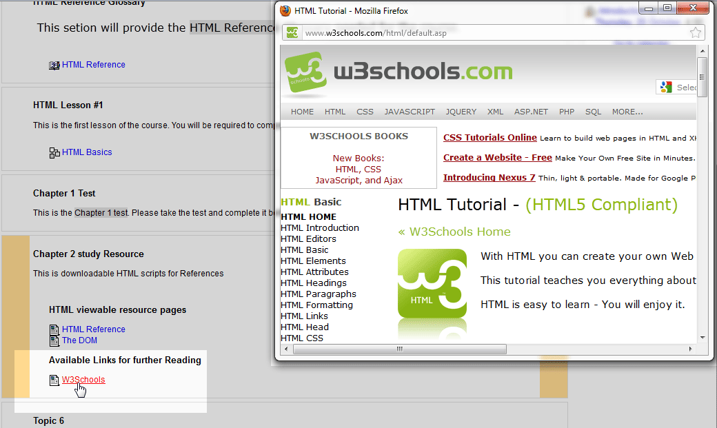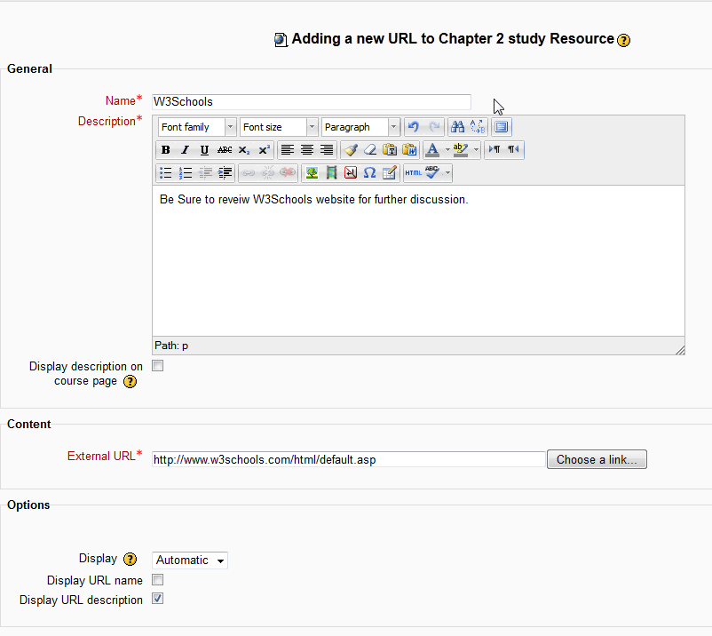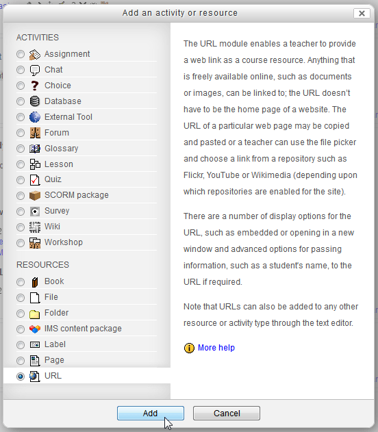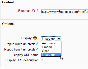 Placing an External URL using the Moodle URL module Updated on August 16, 2021 by InMotion Hosting Contributor 1 Minutes, 30 Seconds to Read Now that Making pages for courses with the page module in Moodle was discussed, creating an External link in the Course section with the URL module is the next topic. This module is handy for navigating students to External sites that have extra curricular information in regards to the Course. This article was written using the Moodle 2.3 version. Creating External link with the URL module log into the Moodle Dashboard Once in the Moodle Dashboard, select the course and click the Add an activity or resource button to add a File. Select the URL radio button and click Add. Important! Keep in mind that Editing must be turned on in the Settings section in order to edit any of these options. Enter the information for the External Link. The Name, Description, and the External URL are required in this section. When finished, click Save and return to courses. Hint! When setting a URL to navigate to an External Web page, the Moodle site will load the page in the same window, unless you select In Pop-Up from the Display drop box in the Options section. Once the link is saved, visit the Course Section where the URL was added. It should look similar to the following snapshot. When clicking the link, because it was set to In Pop-Up, the window will open in a separate browser window (See snapshot for In Pop-Up view). This will prevent the student from leaving the Moodle site, allowing the user or student to close the pop up without having to use the back button to return to the Course. This concludes the overview for the Moodle adding an external link using the URL module in Moodle.. For more information on this Education Channel please visit Adding an activity or resource to a course in Moodle Share this Article InMotion Hosting Contributor Content Writer InMotion Hosting contributors are highly knowledgeable individuals who create relevant content on new trends and troubleshooting techniques to help you achieve your online goals! More Articles by InMotion Hosting Related Articles How to install Moodle using Fantastico Installing Moodle with Softaculous How to Add Content Security Policy in Moodle With the Local CSP Plugin Inserting an image slider in Moodle Changing the Moodle admin password through PhpMyAdmin Fix “uploaded file may exceed the post_max_size directive in php.ini” How to Add the Quiz Module in Moodle Adding the File Resource Module to Moodle Courses Integrate Jitsi with Moodle Courses How to Install a Plugin in Moodle