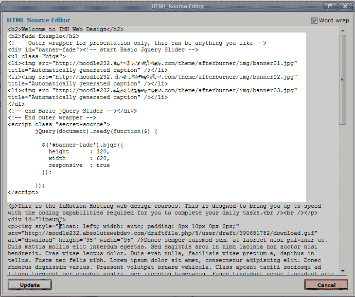 Inserting an image slider in Moodle Updated on June 19, 2023 by InMotion Hosting Contributor 3 Minutes, 13 Seconds to Read Moodle does not have a built in slider available in the Moodle plugins, so, in order to add a slider, you will need to code it into your page using jQuery. There are many free jQuery plugins you can use to get a slider working. In this tutorial we will use the Simple jQuery slider. The jQuery plugin is available at the following url. https://github.com/jcobb/basic-jquery-slider/zipball/master After you get the plugin zip file named jcobb-basic-jquery-slider-8ffe118.zip you will be able to upload the files necessary for the slider to work. Below are the steps to insert the Simple slider in your Moodle site. Important! This tutorial explains how to add the jQuery slider in the AfterBurner theme. The steps are basicaly the same for the other themes as well. Adding the Simple jQuery slider to Moodle Upload the slider zip file to the theme folder. In this case the afterburner theme is in the /theme/afterburner directory. Extract the .zip file so the files are in the directory like the snapshot to the right. Edit the following files in your Moodle theme files./theme/afterburner/layout/default.php /theme/afterburner/layout/embedded.php Paste the following code in the head section of your theme files.<!-- bjqs.css contains the *essential* css needed for the slider to work --> <link rel="stylesheet" href="bjqs.css"> <!-- some pretty fonts for this demo page - not required for the slider --> <link href='https://fonts.googleapis.com/css?family=Source+Code+Pro|Open+Sans:300' rel='stylesheet' type='text/css'> <!-- demo.css contains additional styles used to set up this demo page - not required for the slider --> <link rel="stylesheet" href="demo.css"> <!-- load jQuery and the plugin --> <script src="https://code.jquery.com/jquery-1.7.1.min.js"></script> <script src="js/bjqs-1.3.min.js"></script> Important! Make sure you make the links in your code go to your server location with the URL. Instead of : <link rel="stylesheet" href="bjqs.css"> You will need to reference your files like this: <link rel="stylesheet" href="https://example.com/theme/afterburner/bjqs.css"> Save the changes. Log into Moodle. Edit the page you want the slider to show up on. Click the Edit HTML Source button in the WYSIWYG editor. Paste the following code into your page where you want the slider to show. <!-- Outer wrapper for presentation only, this can be anything you like --> <div id="banner-fade"> <!-- start Basic Jquery Slider --> <ul class="bjqs"> <li><img src="https://example.com/theme/afterburner/img/banner01.jpg" title="Automatically generated caption"></li> <li><img src="https://example.com/theme/afterburner/img/banner02.jpg" title="Automatically generated caption"></li> <li><img src="https://example.com/theme/afterburner/img/banner03.jpg" title="Automatically generated caption"></li> </ul> <!-- end Basic jQuery Slider --> </div> <!-- End outer wrapper --> <script class="secret-source"> jQuery(document).ready(function($) { $('#banner-fade') .bjqs({ height : 320, width : 620, responsive : true }); }); </script> Important! Make sure you make the links in your code go to your server location with the URL and that your images are stored in the theme/afterburner/img folder location. Instead of : src="img/banner03.jpg" You will need to reference your files like this: src="https://example.com/theme/afterburner/img/banner03.jpg" If not the images will not load. Save the files. Now your Moodle will have a slider with your images on it. Share this Article InMotion Hosting Contributor Content Writer InMotion Hosting contributors are highly knowledgeable individuals who create relevant content on new trends and troubleshooting techniques to help you achieve your online goals! More Articles by InMotion Hosting Related Articles How to install Moodle using Fantastico Installing Moodle with Softaculous How to Add Content Security Policy in Moodle With the Local CSP Plugin Inserting an image slider in Moodle Changing the Moodle admin password through PhpMyAdmin Fix “uploaded file may exceed the post_max_size directive in php.ini” How to Add the Quiz Module in Moodle Adding the File Resource Module to Moodle Courses Integrate Jitsi with Moodle Courses How to Install a Plugin in Moodle