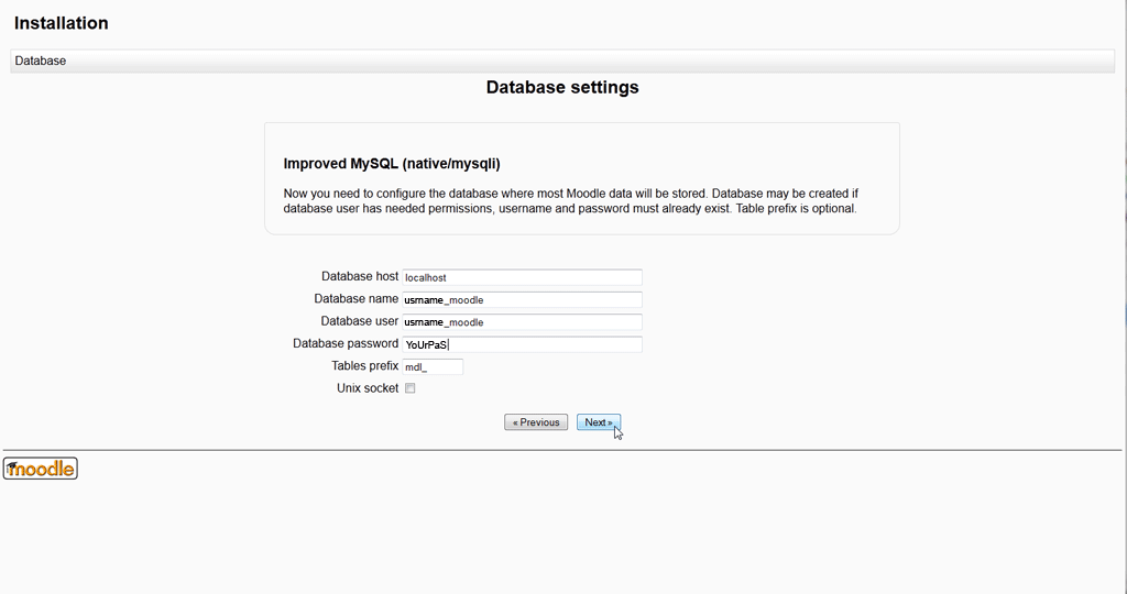 How to install Moodle 2.3.2 manually Updated on August 16, 2021 by InMotion Hosting Contributor 5 Minutes, 27 Seconds to Read The focus of this article is to outline the steps for installing Moodle 2.3.2. The setup is relatively simple and similar to other Open Source Software program installations. First the server must meet the required system requirements. This tutorial is focused on cPanel hosting servers. Other Non-cPanel hosting companies may have a different way of setting up databases, getting server specs and so forth. Please contact the hosting company to determine how to accomplish these tasks. Moodle 2.3.2 Requirements The following server configuration is required for Moodle to be installed on the server. PHP 5.3.2 MySQL 5.1.33 To find the php version and MySQL version on the server please refer to this guide. Moodle 2.3.2 Installation Steps Download Moodle 2.3.2 When looking for the Moodle version to download, there will be several available typically. The version to download is the Current stable builds. Moodle can be downloaded at the following link.download.moodle.org Typically the download will be in a .zip, .rar, .tgz or other file format. The file that was downloaded for this tutorial was moodle-2.3.2.tgz. These can simply be extracted through your file manager when uploaded. Upload Moodle 2.3.2 Once a copy of Moodle is downloaded, the files will need to be uploaded to the server. The archive file of Moodle can be uploaded directly to the server and extracted or the file can be extracted on the local computer and the uploaded to the document root location for the moodle install. When extracting and uploading the files to the server, Keep in mind that the extracted file will put the files in a subfolder (typically called “moodle”). Make sure the files are not placed in a subfolder. If the files are in a subfolder, move the files to the correct location using the File Manager or an FTP client. The files will need to be directly in the document root folder. Create the Database for the Installation In order to install Moodle 2.3.2, a database will need to be created with a database user added to it. Moodle stores the content in the database and pulls that content into the web page using php server scripting. For more information on setting up a database on the server please see the following link on “How do I create a MySQL database in my control panel (cpanel)?” Keep in mind that the server host on the server will be localhost and that the user created for the database will need to be added to the database. If not, the installation will give a database connection error. Make sure the database username, database name, and password are saved in a notepad or other text editor so they can be referenced later during the install. They will be needed for the 4.4 Database settingssection of the Moodle install. IMPORTANT! Make sure when creating the database that the collation is set to utf8_unicode_ci or you will get the following error. The collation for the database can be set in PhpMyAdmin on the structure tab. “It is required that you store all your data in Unicode format (UTF-8). New installations must be performed on databases that have their default character set as Unicode. If you are upgrading, you should perform the UTF-8 migration process (see the Admin page).” Initial set up for Moodle When installing Moodle 2.3.2, the installation is done through the browser by visiting the site where the Moodle was uploaded. For example, if Moodle is being installed on a subdomain or subfolder the url will look similar to the following. SubFolder https://example.com/moodle Subdomain https://moodle.example.com When visiting for the first time, the Choose a Language screen will show at first. Select the required language and click Next. 4.2. Confirm Paths The next screen will prompt you to Confirm the installation paths for the Moodle installation. The Web Address and the Moodle directory should be set by the install script by default. The Data Directory Will be set as well; except it can be changed if you want the installation in a different directory location on your server. Leave the default paths and click Next. 4.3. Choose Database Driver The database driver is what your server will use to connect to the database. On Linux/cPanel servers, the setting required is Improved MySQL (native/mysqli). Select Improved MySQL (native/mysqli) then click “Next”. If the server the Moodle is installed on is not Linux/cPanel, then an inquiry will need to be sent to the hosting company to find which database is supported. 4.4. Database Settings Use the Database settings that were set on step 3 Create the Database for the Installation. Enter the database name, username, and password. Leave the table prefix as is as this is set for the database table names. Leave the Unix Socket setting unchecked and click Next. 4.5. Copyright Notice This page is for accepting the General Public License. Select Continue to go to the next install screen. 4.6. Server Checks The Server checks page is important as it will examine the server for configuration requirements. Required server configuration settings for Moodle to work will highlight in red. Most of these configuration changes can be set it the php.ini. For more information on setting php.ini values please see the “How to update your local php settings“. The Yellow highlighted configuration settings are Warnings and Moodle can be installed if they are simple Warnings. If for whatever reason the Red settings cannot be changed, the web hosting company will need to look at the server to fix these. When the Server Checks are at an acceptable level click Continue. 4.7. Server Installation After the Continue button is clicked on the Server Checks Screen, the install script will show a list of tables that are set up for the database. Each should say Success in green font. When Finished Click Continue. The Administration set up screen will load f