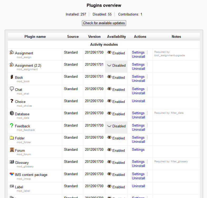 Moodle 2.3 Plugin Overview Updated on August 16, 2021 by InMotion Hosting Contributor 3 Minutes, 3 Seconds to Read Moodle 2.3 has the capability of enabling, disabling, installing and uninstalling plugins that are used for the Moodle site to function. Plugins are used in the activities and resourcres, assignments, and many more functions within the Moodle site. Before installing any new plugins that are not in the original Moodle installation, lets overview what the default Moodle 2.3 plugins contain. Default Moodle plugins overview Log into the Moodle Dashboard Navigate to Site administration > Plugins in the settings section to the left. Note! Not all plugins are installed by default. The installed plugins will appear in the list of the plugins section in the Site administrators Settings. The install directories are referenced from the location where Moodle was installed. For Example, on a cPanel server the Moodle installation directory may look like: /home/username/public_html/moodle Any reference to a directory like: /blocks Will reference the directory like the following: /home/username/public_html/moodle/blocks Plugins can be updated through the Plugin Overview if the plugin has an available update. The following table overviews the default installed plugins. Default installed plugins Activity modules The activities module is used for adding different user interactive behaviours in course sections such as Quizzes, Assignments, Glossaries, and so forth. Directory location: /mod. Assignment plugins The default Moodle 2.3 Assignment plugins are: Submission plugin: Generates forms for assignment submissions. Directory location: /mod/assign/submission Feedback plugin: Generates forms for assignment feedback. Directory location: /mod/assign/feedback Blocks The blocks plugin allows for blocks to be configured in the navigation. Directory location: /blocks Message outputs This plugin allows the Messaging to work over different forms such as email or jabber. Directory location: /message/output Authentication Enables authentication for the users. Directory location: /auth Enrolments Allows the enrolment of users into courses. Directory location: /enrol Text editors Enables HTML editors. Directory location: /lib/editor Licences Stores any license required for plugins. Directory location: path unknown Filters This plugin coverts text. Text can be highlighted or transformed. Directory location: /filter Repositories This plugin allows users to connect to external sources. Directory location: /repository Web services Allows different coding languages like JSON or SOAP to have code added to their functionality. Directory location: /webservice Question behaviours This plugin controls the interaction between the user and the questions. Directory location: /question/behaviour Question types Adds a variety of different question types available for quizzes. Directory location: /question/type Plagiarism prevention This plugin will match user or student submitted material to Plagiarism prevention programs. Directory location: /plagiarism Reports Provides reports for the site administrator. Directory location: /report Admin tools This plugin enables scripts for the administrator to edit the site. Directory location: /admin/tool Local plugins Provides local customization. Directory location: /local Click Plugins overview. This section will list the installed and available plugins for the Moodle site. Plugins that can be uninstalled will look like the snapshot to the right. Plugins that are a part of the Moodle software are shown like the snapshot to the right. These cannot be uninstalled in this section. The plugins overview will display the plugins that are installed in the Moodle site. The following table will show what the overview will show. Plugins overview Plugin name Lists the name of the plugin. Source Shows the development source of the plugin. Examples are Standard, Extension, or Contributed. Version Shows the date the plugin was created. Availability The availability shows whether the plugin is Enabled or Disabled . Actions The plugin can be uninstalled here. The settings can be changed on some of the plugins. Notes Necessary notes for the plugin. Usually shows the Required by information for the plugin. This concludes the article for Moodle 2.3 Plugin Overview. Share this Article InMotion Hosting Contributor Content Writer InMotion Hosting contributors are highly knowledgeable individuals who create relevant content on new trends and troubleshooting techniques to help you achieve your online goals! More Articles by InMotion Hosting Related Articles How to install Moodle using Fantastico Installing Moodle with Softaculous How to Add Content Security Policy in Moodle With the Local CSP Plugin Inserting an image slider in Moodle Changing the Moodle admin password through PhpMyAdmin Fix “uploaded file may exceed the post_max_size directive in php.ini” How to Add the Quiz Module in Moodle Adding the File Resource Module to Moodle Courses Integrate Jitsi with Moodle Courses How to Install a Plugin in Moodle