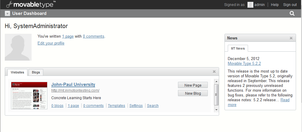 How to log into your Movable Type admin dashboard Updated on August 16, 2021 by Scott Mitchell 0 Minutes, 43 Seconds to Read Now that you have installed your Movable Type application, you will need to know how to log into the administration section. The steps below will guide you on accessing your administration dashboard for your Movable Type application. Logging into your Movable Type Admin section Visit your Moveable Type dashboard login page. This is a bit tricky as it is not obvious at first. There is no login or sign in link on the main screen. Your login URL will be example.com/cgi-bin/mt.cgi. (Be sure to replace example.com with your own domain name.)This will bring up your login screen. Login using your admin username and password. Type in the admin username and password you created in the installation process and then click on the Sign In button just under the credential fields. Congratulations! You have logged in for the first time. Share this Article Related Articles Resetting Your Password in Movable Type How to Set Your Movable Type Homepage Adding an External Link to the Menu in Movable Type Creating a Contact Page in Movable Type Using the Activity Log in Movable Type How to Create a User in Movable Type How to Install Movable Type with Softaculous How to Add Google Analytics to a Movable Type Website How to change the theme in Movable Type Movable Type permissions changing to 666