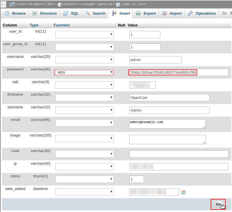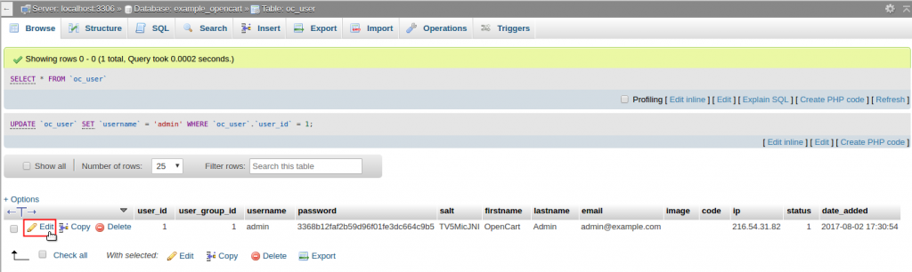 3. OpenCart User TableFind the “user” table and then click on Edit, next to your “admin” user entry.