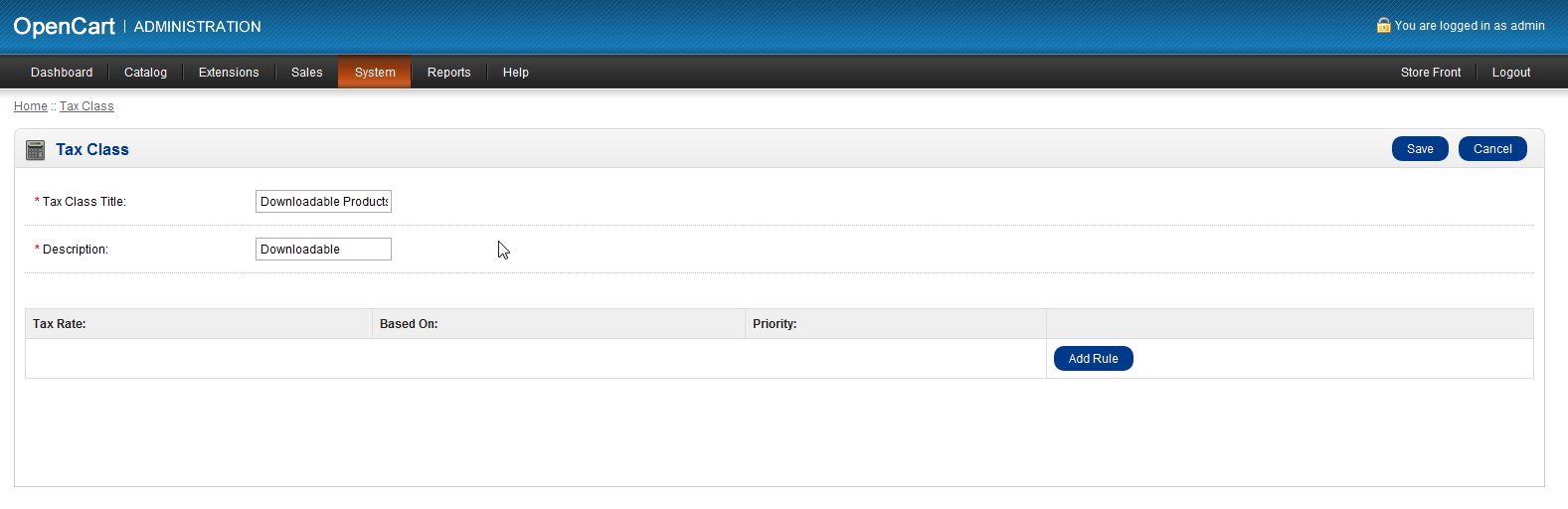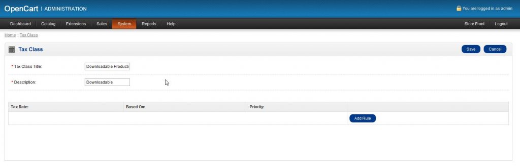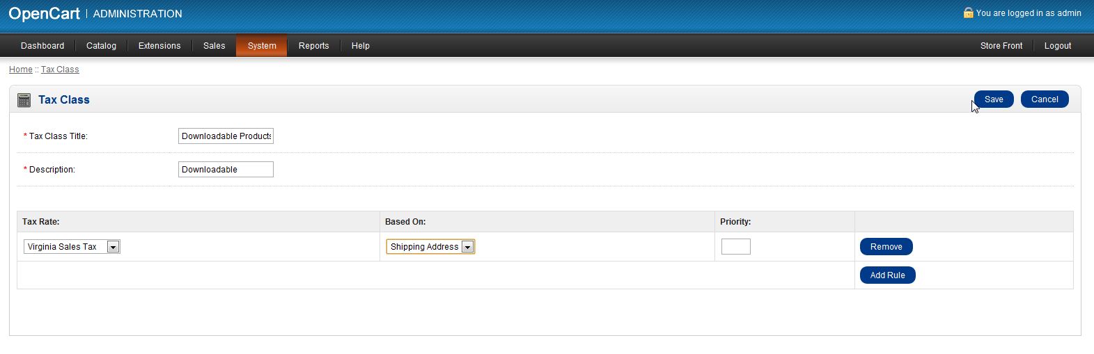 Adding a Tax Rate to an Existing Tax Class in OpenCart Updated on August 16, 2021 by Carrie Smaha 0 Minutes, 50 Seconds to Read Once you have set up a tax rate, you will have to assign it to a tax class for it to work properly. This tax rate will be applied to any product that is assigned to that tax class. How to Add a Tax Rate to a Tax Class Log into your OpenCart Dashboard Go to System > Localisation > Taxes > Tax Classes Click on “Edit” for the tax class you want to apply the tax rate to Select “add rule” to add a tax rate and from the drop down menu choose the tax rate and what address you want the rule “Based On” Click “Save” in the upper right corner Now, if one of your visitors purchases a product that is assigned to that specific tax class and the address they enter matches the Geo Zone assigned to the Tax Rate, the tax will be applied to the product. If you need further assistance please feel free to ask a question in our support center website. Share this Article Carrie Smaha Senior Manager Marketing Operations Carrie enjoys working on demand generation and product marketing projects that tap into multi-touch campaign design, technical SEO, content marketing, software design, and business operations. More Articles by Carrie Related Articles My OpenCart 3 Contact Form Won’t Send Emails Backup Your OpenCart Database in Admin Dashboard How to Enable SSL (https) in OpenCart 3 Adding a Tax Rate to an Existing Tax Class in OpenCart OpenCart 3 Maintenance Mode Update Your OpenCart 3 Favicon and Store Logo