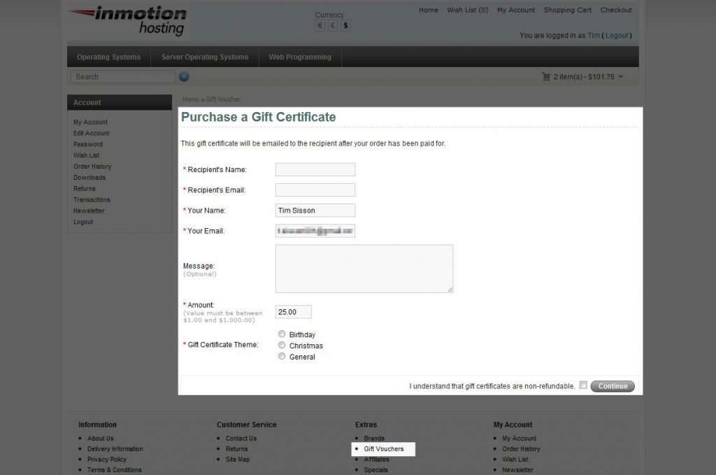 Selling Gift Vouchers on your OpenCart 1.5 Website Updated on March 11, 2022 by Carrie Smaha 1 Minutes, 7 Seconds to Read OpenCart gives you the ability to sell gift vouchers for merchandise on your website. By default the website visitors can purchase gift vouchers on your site by clicking on the link on the “extras” section of the footer. The customer will then be prompted to fill out the information for the gift voucher. By default the customer can purchase any amount for a gift voucher from $1 to $1000. This is then applied to a code, which would be entered into the shopping cart by the customer at the time of purchase. A gift voucher code is not attached to a specific account when it is created. This is different than a store credit, since store credits are applied to a specific user’s account. Gift vouchers are sent via email in the form of a code to be used during the checkout process. It’s important to understand that discounts are not offered on gift vouchers. Also, the gift voucher code will not be sent until the order status is updated to “complete”. This ensures that the gift voucher is paid for prior to sending the email. Please read our article on manually creating Gift Vouchers, if you find you need to create a gift voucher manually through the OpenCart Dashboard. If you need further assistance please feel free to ask a question on our support center website. Share this Article Carrie Smaha Senior Manager Marketing Operations Carrie enjoys working on demand generation and product marketing projects that tap into multi-touch campaign design, technical SEO, content marketing, software design, and business operations. More Articles by Carrie Related Articles Editing the Information Pages in the Footer of OpenCart My OpenCart 3 Contact Form Won’t Send Emails Resetting your OpenCart Admin Password with the Forgot Password link Using Free Cloudflare for SSL on OpenCart 1.5 Adding your store logo to your OpenCart 1.5 website Changing your Admin Password in OpenCart 1.5 Restoring a Database Backup in OpenCart 1.5 Sending Emails to Customers through OpenCart 1.5 How to Enable SSL Connection in OpenCart 1.5 Creating a 404 error page for OpenCart