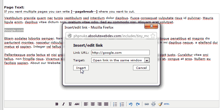How to create an external link in PHP-Nuke Updated on August 16, 2021 by InMotion Hosting Contributor 0 Minutes, 33 Seconds to Read You can create links to external sites through the PHP-Nuke WYSIWYG editor in the admin dashboard. In the tutorials below, we are going to make a link that takes you to https://google.com when clicked. Creating an external link Log into your PHP-Nuke Dashboard. Edit the page you want to insert a link into. Highlight the text you want to make into a link and click the Insert/edit link button in the WYSIWYG editor. Type the url you want the link to go to. Click Insert. Now the text will work as a link that will take you to the url you put in the Insert/edit link box. Share this Article Related Articles Working With the Feedback Page in PHP-Nuke Adding an Image to a Page in PHP-Nuke How to Change the Language Used in PHP-Nuke How to use Google Analytics with PHP-Nuke How to Enable SSL Certificate in PHP-Nuke How to change the theme in PHP-Nuke How to login to the Administrator System in PHP-Nuke How to Install PHP-Nuke with Softaculous How to create a block in PHP-Nuke How to reset your admin password for PHP-Nuke