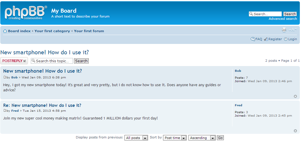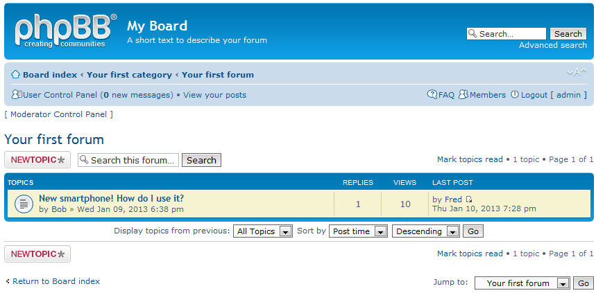How to delete a topic or reply in phpBB Updated on March 11, 2022 by Scott Mitchell 1 Minutes, 46 Seconds to Read As your community begins to form, visitors will sign up and begin to create topics and replies. You or your moderators will now spend time going through the forums and keeping things in order. There will be times when you run across a post or topic that you want to remove from your site. Below is the setof instructions on how to delete a post in phpBB 3.0 Deleting topics and replies in phpBB 3.0 Log into the website. You do not have to enter the MCP or ACP as of yet. You shoud be logged in and at the main page of the forum, this is known as the Board Index. If you are in your MCP or ACP, scroll down to the bottom of the page. You will see a link next to a house icon entitled Board Index. Click that to go to the main forum area. Once you are on the Board Index, click on the Forum you want to enter. In our example, we are going to enter the Your first forum forum. This brings you to a page that has the list of topics for the forum. Click on the particular topic you need to enter. Continuing our example, we click on the only topic on the page, New smartphone! How do I use it?. You are now at the level where you will see all the reply posts related to the topic. The original topic post is at the top, with the reply posts listed underneath in the order they were made. Note that each post has a set of icons across the top. Find the post (topic or reply) you want to remove and find the Delete button (the one with the X) in the list. Click the Delete button to remove the post. You will be asked to confirm the deletion of the post. Click the Yes button to confirm and continue. After clicking, you will be shown a deletion confirmation message. The post will now no longer be displayed on the forum. Below is a before and after screenshot to demonstrate how the site will look. Before After Share this Article Related Articles How phpBB Community Software Works How to Activate a New Language in phpBB 3.0 Editing permission roles in phpBB 3.0 Editing syndication feed settings in phpBB 3.0 Editing avatar settings in phpBB 3.0 Editing a post as a moderator in phpBB 3.0 Creating a new forum in phpBB 3.0 Copying forum permissions in phpBB 3.0 How to change forum level permissions in phpBB 3.0 How to manually install phpBB