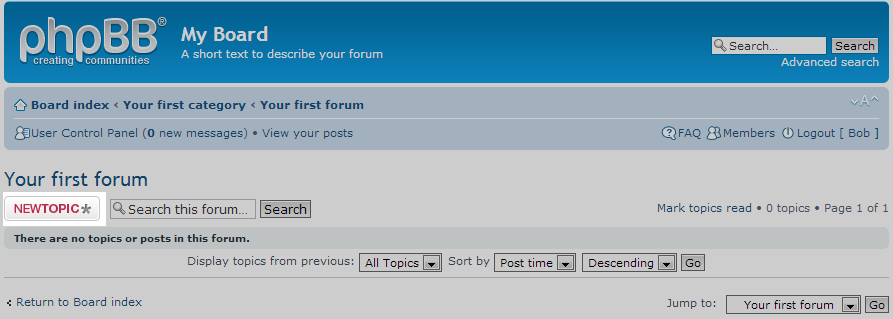 How to create a new forum topic in phpBB 3.0 Updated on August 16, 2021 by Scott Mitchell 2 Minutes, 26 Seconds to Read After members create an account (we will cover this soon), they will want to jump right in and start contributing to the site. As an administrator, you will need to know how to create topics and replies so you can help create the foundation of your community. Topics are the individual conversations, or threads, that should be related to the forum they are under. For example, you would not want to create a topic on recipes in a Sports forum. The steps below will walk you through creating a new topic in your phpBB site. Within each forum, you will have individual topics. For example, if you have a Sports forum, you may have baseball and basketball topics within. Both regular users and site admins can create these topics and follow the same process. Creating a new topic in phpBB Log into your phpBB website. Users will sign in as themselves, Administrators can sign in as either Admin or a user account, if they have one. In this example, we have created a test user named Bob who will be creating a new topic. The main page returns and you will see the account you are logged in as in the upper right corner of the page. On the page is a list of categories. Categories are divisions of forums, usually grouped by topic. From here, select which category you want to create your topic under. Click on the forum name to continue to the next screen. For our example, Bob is going to add a new topic under the Your First Forum forum. You are now on the topic list page. As we are creating the first topic, there are no others listed on the screen. To create a new topic, click on the NEW TOPIC button found in the upper left hand corner of the screen. This is the New Topic page where you will create your initial topic. SubjectFirst enter your topic in the Subject line. For example, our new topic is entitled New Smartphone! How do I use it?. BodyUnder that is large a text area where you can create the body of your message. It has several buttons across the top to help you format your text such as Bold, Italics, adding hyperlinks, etc. Preview and/or SubmitAlthough optional, it is recommended you take a look at what your new topic will look like by clicking the Preview button. Once you have entered your new topic data, click on the Submit button found just underneath the body area. After submitting your topic, it will be published to the forum and you will be redirected to your new topic page. This appears just as all website visitors will see it. Your post will also now appear under the forum Your First Forum. Also, now that a user has created a topic, other users will be able to reply to it, starting a conversation. Share this Article Related Articles How phpBB Community Software Works How to Activate a New Language in phpBB 3.0 Editing permission roles in phpBB 3.0 Editing syndication feed settings in phpBB 3.0 Editing avatar settings in phpBB 3.0 Editing a post as a moderator in phpBB 3.0 Creating a new forum in phpBB 3.0 Copying forum permissions in phpBB 3.0 How to change forum level permissions in phpBB 3.0 How to manually install phpBB