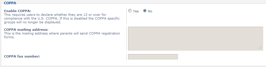Enable COPPA Enabling this requires users to state whether they are over the age of 13 in compliance with the U.S. Children’s Online Privacy Protection Act.