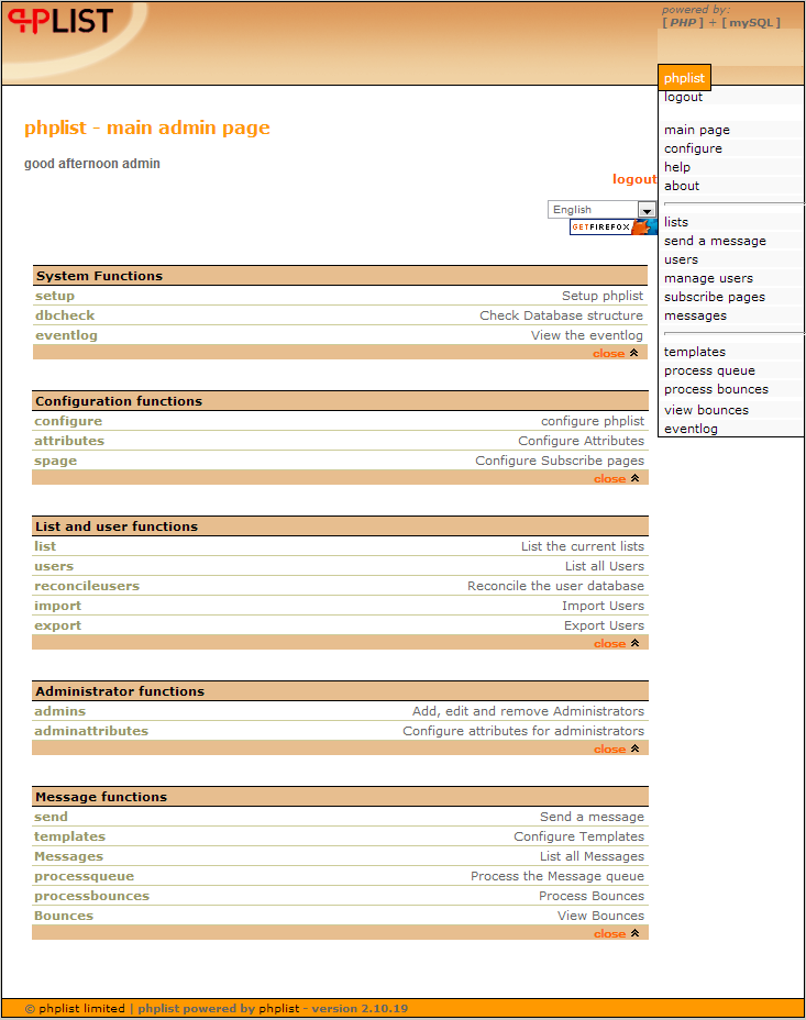 You should now have successfully logged into your phpList admin dashboard. From here you’ll be able to modify the settings of your phpList installation, manage your users and lists, and send out your mailings.