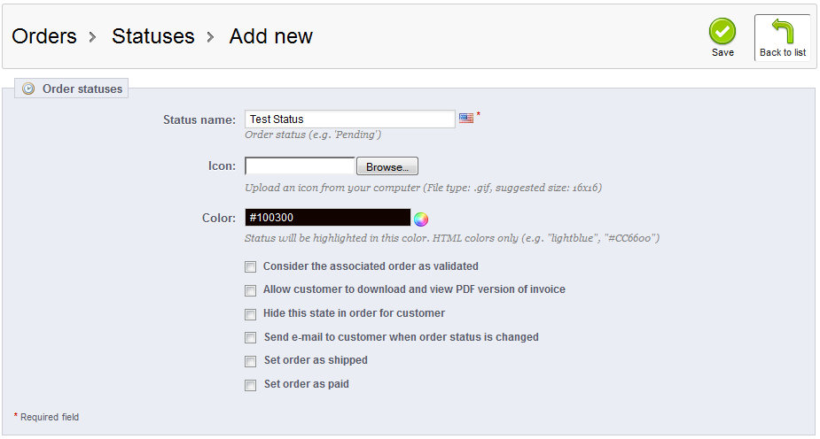 Adding a new order status in PrestaShop 1.5 Updated on August 16, 2021 by Scott Mitchell 1 Minutes, 18 Seconds to Read PrestaShop 1.5 provides many different order statuses to help you manage your customers. You may also want to create your own custom order status for your shop. These statuses are color coded for easy identification in the order list. To learn to set a new order status in PrestaShop 1.5, simply follow the instructions below. How to create an order status in PrestaShop 1.5 Log into your PrestaShop 1.5 admin dashboard. Using the top menu bar, hover over the Orders tab and click on the Statuses option. This leads you to the Statuses list screen. To create a new status from here, click on the green Add New button in the upper right corner. You are now on the Status creation screen. You will see a form with several fields. The first three are for creating the name and look of the status (name, icon, and color). The second section of fields are checkboxes which govern the action the status takes on the order. Click any of the checkboxes that apply to your new status. You can view them here: Consider the associated order as validated Allow customer to download and view PDF version of invoice Hide this state in order for customer Send e-mail to customer when order status is changed Set order as shipped Set order as paid Once you have entered the information and are satisfied with it, click on the green Save button in the upper right corner to finalize the new status. You will return to the attachment list screen where you will see your new status in the list. Share this Article Related Articles Adding a category in PrestaShop 1.6 How to Add a Product to your PrestaShop 1.6 Store Best Practices for Creating a PrestaShop Shop Fix 404 Error When Logging into PrestaShop 1.5 How to reset your admin password in PrestaShop 1.5 Working with the product SEO tab in PrestaShop 1.6 Adding Shipping Details to Products in PrestaShop Install a Theme in PrestaShop 1.6 How to enable/disable the new customer notification in PrestaShop 1.5 How to install and set up the UPS Carrier module in PrestaShop 1.5