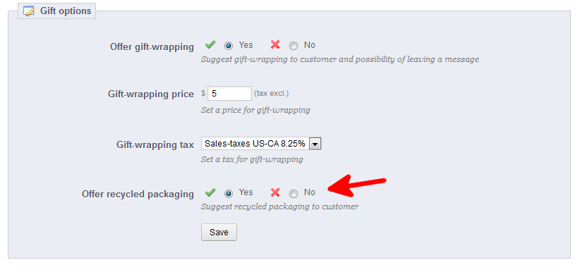 Setting the Recycled packaging option in PrestaShop 1.5 Updated on August 16, 2021 by Scott Mitchell 0 Minutes, 39 Seconds to Read After enabling gift wrapping service and setting the price, you can offer the option of using recycled packaging. This setting allows you to offer recycled packaging to your environmentally conscious customers. Setting the Recycled Packaging option in PrestaShop 1.5 is a simple task. To set the Recycled Packaging option in PrestaShop 1.5: Log into your PrestaShop 1.5 dashboard. Using the top menu bar, hover over the Preferences tab and select the Orders option. From the Preferences : Orders screen, find the Gift Options section and then the Offer Recycled Packaging field. Select Yes if you want to offer recycled packaging or No if you do not wish to offer this service. Once finished, click on the Save button in the upper right corner of the screen. You have now edited the Recycled Packaging option in PrestaShop Share this Article Related Articles Adding a category in PrestaShop 1.6 How to Add a Product to your PrestaShop 1.6 Store Best Practices for Creating a PrestaShop Shop Fix 404 Error When Logging into PrestaShop 1.5 How to reset your admin password in PrestaShop 1.5 Working with the product SEO tab in PrestaShop 1.6 Adding Shipping Details to Products in PrestaShop Install a Theme in PrestaShop 1.6 How to enable/disable the new customer notification in PrestaShop 1.5 How to install and set up the UPS Carrier module in PrestaShop 1.5