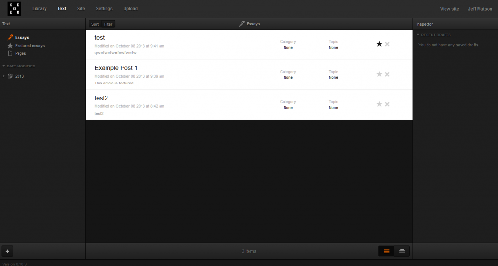 Koken Essays and Pages Updated on June 8, 2023 by Jeff Matson 2 Minutes, 54 Seconds to Read While Koken is more made for artists to display images, it also supports written content very well. In this article, we will outlink the various options for written content such as essays and pages. Before you begin this article, be sure that you have have installed Koken as well as are logged into the Koken admin. Essays in Koken Essays in Koken are similar to blog posts. They are laid out in a single section which will alow users to review updates as you post them within a single page. If you want to post any news about your work, new events, or just give out some new updates to your users, essays within Koken are your best option. Creating an essay in Koken To create some essays in Koken, it is quite easy to do. Koken provides a wonderful tool to effectively write, format, and publish your content all within a single place. To add an essay post in Koken, go to the “Text” tab up top in your Koken admin panel and click on “Essays”. Within this tab, it will display any essays that you have already written. To add a new essay in Koken, click on the “+” button to the bottom left of the screen. Once you have created a new post, you will be taken to the edit screen. From here, you may type out all of your Koken that you want to display within the individual post. You may also modify things like the title, and except of the post, categories, and so on to ensure the best experience possible for your visitors. After you have written your essay post in Koken to display as you want it to, you can then press the “Publish live” button to the bottom right which will make the essay go live on your site. Deleting an essay in Koken Every essay in Koken will have a “X” to the right of it when in the Text tab. Click on that icon the delete any unwanted posts. Editing an essay in Koken To edit an essay in Koken, just simply click on the post within the Text tab. From here, it will bring you to the same screen that you would see if you were to create the new post. Be sure to then click the publish button to the bottom right again to be sure that your updated Koken essay is live. Featured essays in Koken Depending on your Koken theme, featured articles will allow you to display an article within your home page. If you are trying to generate a lot of focus to a specific update, this is your best option. To set an essay as featured, just click the star icon next to the essay title. To ensure that it displays well for your visitors to notice it, be sure to place some sort of image within the essay as well. Pages in Koken Adding pages in Koken is similar to adding essays. The difference in pages and essays is that pages are static content which will stay the same for a long period of time. Information such as an “About Me” page would be a good option to create a page for in Koken. If you want your page to display within your main navigation bar, you would then go to the Site tab and click on “Add links”. From here, you may add any pages that you want to display within your main Koken navigation. Share this Article Related Articles How to create a basic profile in Logaholic What is Docker? Working with Docker Containers Ubuntu Server: A General Overview Installable Software Reference How to use ImageMagick How to Install Docker on CentOS 7 Creating a new user in SMF 2.0 Changing a user’s password in SMF 2.0 AbanteCart Maintenance Mode
