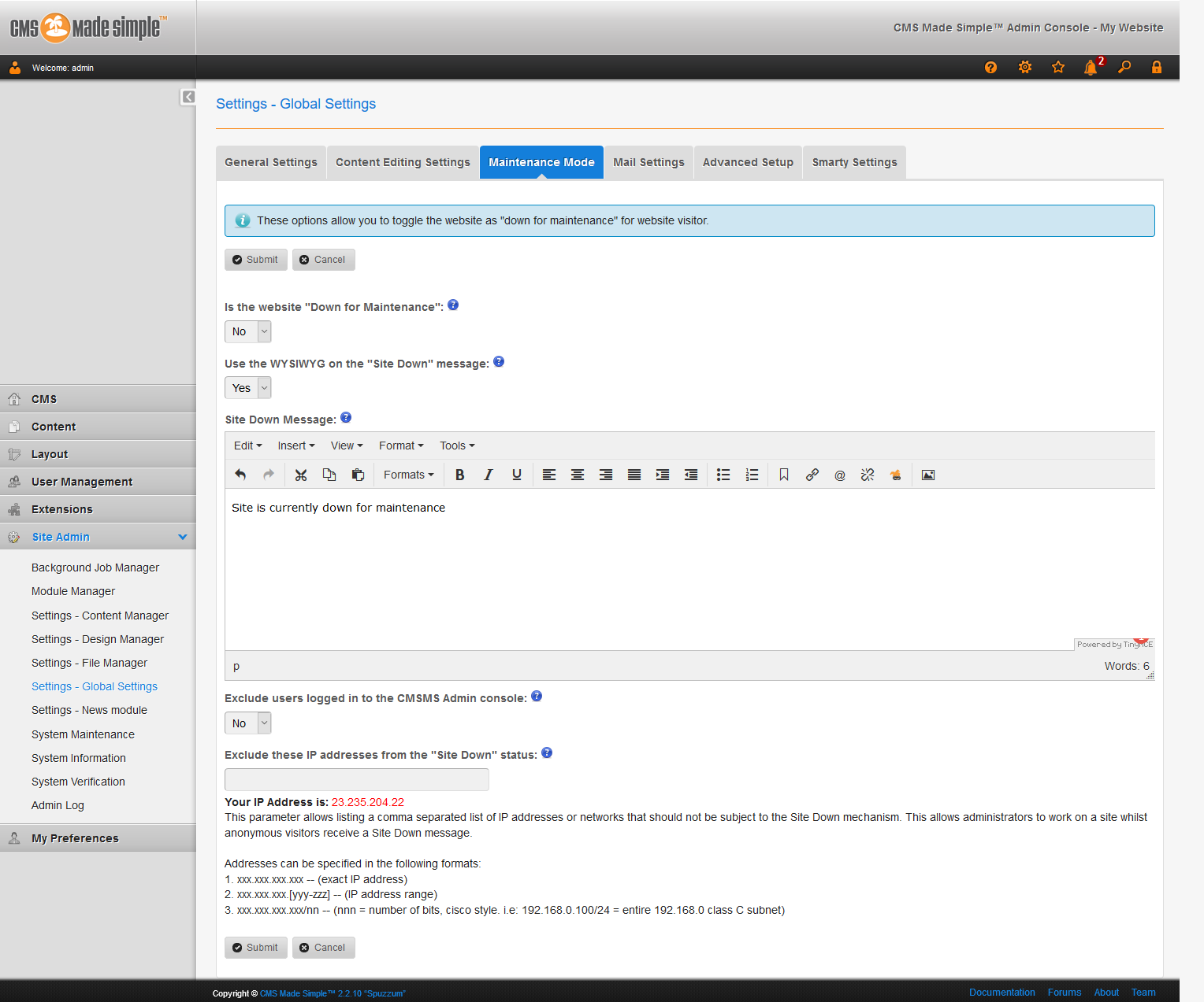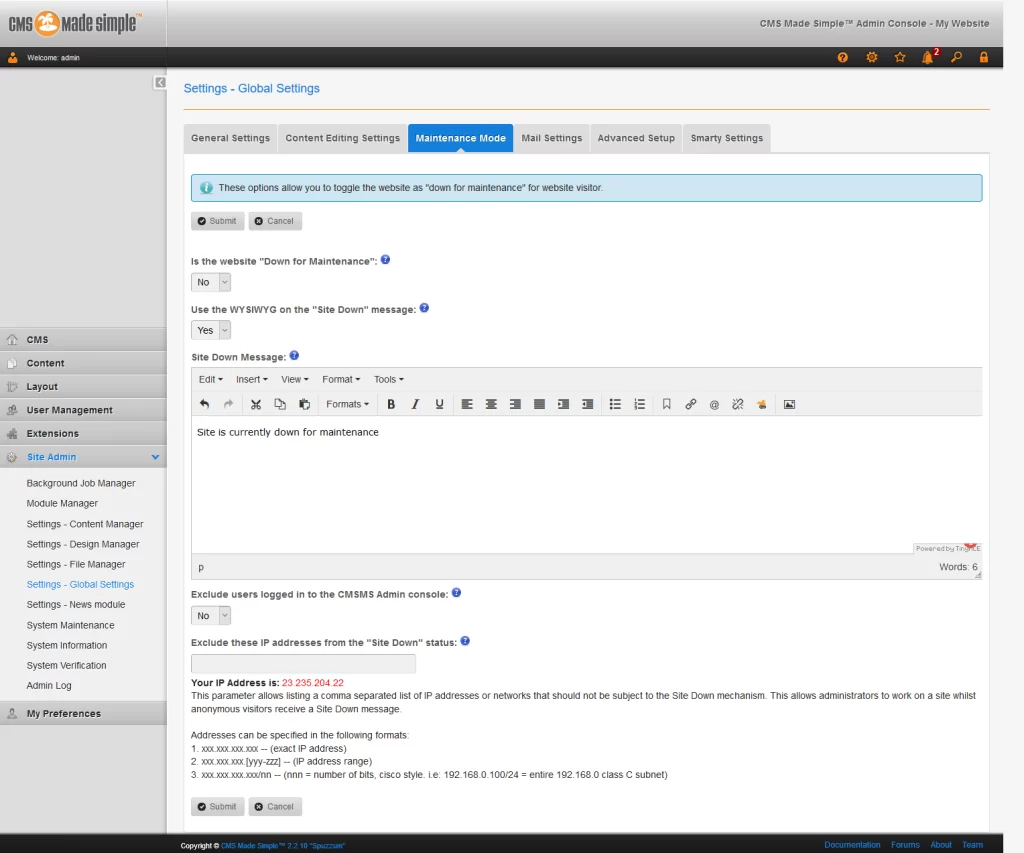 Enable Maintenance in CMS Made Simple Updated on January 3, 2024 by InMotion Hosting Contributor 0 Minutes, 52 Seconds to Read When starting out, you may not want the world to see your progress yet. Below we cover how to set your CMS Made Simple website to maintenance mode. Need a new domain? Buy a domain name or get one free when you purchase one of InMotion Hosting’s Shared Hosting Packages. Maintenance Mode Log into CMS Made Simple. Click Site Admin, then Settings – Global Settings. Locate “Blocks HTML output” in the list of cache types. Select it, and from the “Actions” dropdown menu, choose “Enable.” Click the “Submit” button to apply the changes. Click on the “Blocks HTML output” tab to access configuration settings. Customize block caching settings, including cache lifetime and granular control over block caching. Once configured, click “Save Config” to implement changes. Exclude Users From “Site Down” Status Select “Yes” under Exclude users logged in to the CMSMS Admin console and insert IP addresses to exclude. Click Submit, then Yes. To find more ways to enhance your website, check your system information. Learn more about CMS Made Simple in our Support Center. Share this Article InMotion Hosting Contributor Content Writer InMotion Hosting contributors are highly knowledgeable individuals who create relevant content on new trends and troubleshooting techniques to help you achieve your online goals! More Articles by InMotion Hosting Related Articles How to create a basic profile in Logaholic What is Docker? Working with Docker Containers Ubuntu Server: A General Overview Installable Software Reference How to use ImageMagick How to Install Docker on CentOS 7 Creating a new user in SMF 2.0 Changing a user’s password in SMF 2.0 AbanteCart Maintenance Mode